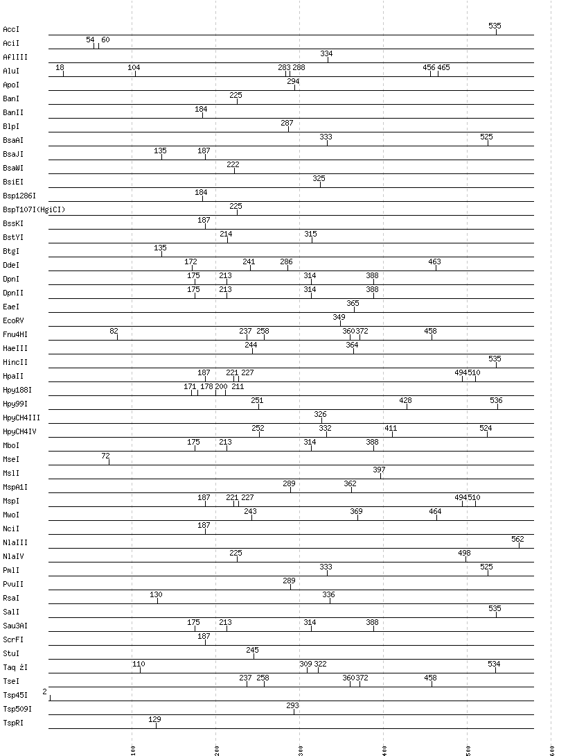 Uncut enzymes: AatII, Acc65I, AccII(FnuDII), AccIII(BspMII), AclI, AfeI, AflII, AgeI, AhdI, AlwI, AlwNI, Aor51HI(Eco47III), ApaI, ApaLI, AscI, AseI, AvaI, AvaII, AvrII, BaeI, BalI, BamHI, BbsI, BbvCI, BbvI, BcgI, BciVI, BclI, BfaI, BglI, BglII, BmrI, BpmI, BsaBI, BsaHI, BsaI, BsaXI, BseRI, BsgI, BsiHKAI, BsiWI, BslI, BsmAI, BsmBI, BsmFI, BsmI, BsoBI, BspDI, BspEI, BspHI, BspMI, BsrBI, BsrDI, BsrFI, BsrGI, BsrI, BssHII, BssSI, BstAPI, BstBI, BstEII, BstF5I, BstNI, BstUI, BstXI, BstZ17I, Bsu36I, BtrI, BtsI, Cac8I, Cfr10I, ClaI, DraI, DraIII, DrdI, EagI, EarI, EciI, EcoNI, EcoO109I, EcoRI, FauI, FokI, FseI, FspI, HaeII, HgaI, HhaI, HinP1I, HindIII, HinfI, HpaI, HphI, HpyCH4V, I-CeuI, I-SceI, KasI, KpnI, MboII, MfeI, MluI, MlyI, MnlI, MscI, N.BstNBI, NaeI, , NarI, NcoI, NdeI, NgoMIV, NheI, NotI, NruI, NsiI, NspI, PI-PspI, PI-SceI(VDE), PacI, PaeR7I, PciI, PflFI, PflMI, PleI, PmeI, PpuMI, PshAI, PsiI, PspGI, PspOMI, PstI, PvuI, RsrII, SacI, SacII, SapI, Sau96I, SbfI, ScaI, SexAI, SfaNI, SfcI, SfiI, SfoI, SgrAI, SmaI, SmlI, SnaBI, SpeI, SphI, SspI, StyI, SwaI, TfiI, TliI, Tth111I, XbaI, XcmI, XhoI, XmaI, XmnI