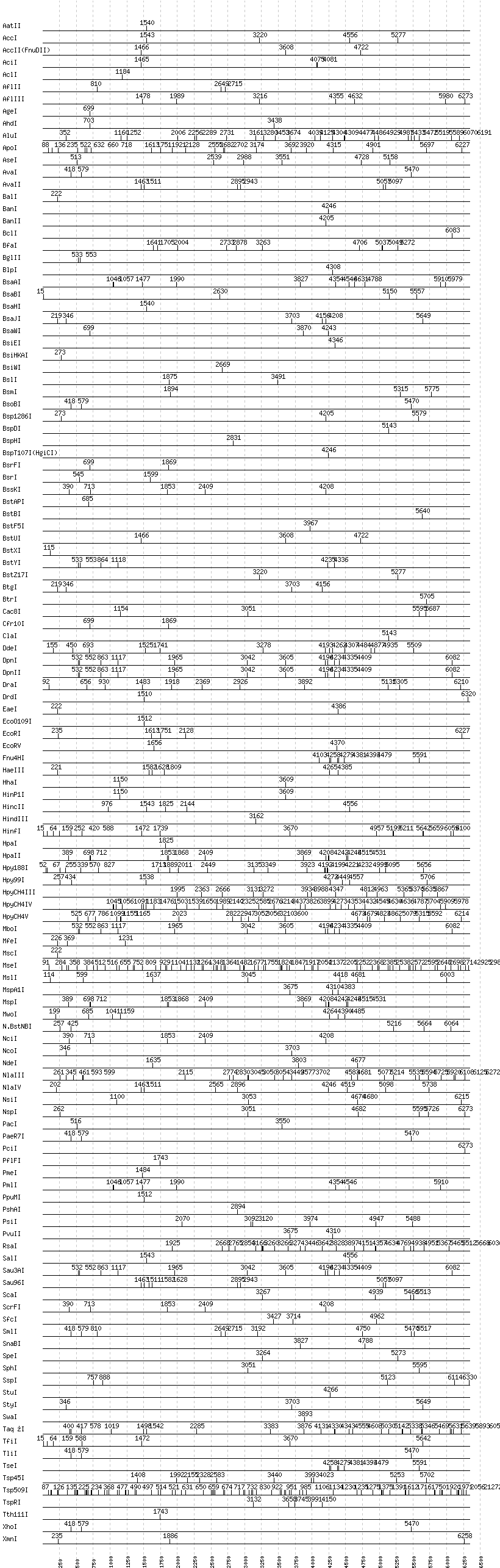 Uncut enzymes: Acc65I, AccIII(BspMII), AfeI, AlwI, AlwNI, Aor51HI(Eco47III), ApaI, ApaLI, AscI, AvrII, BaeI, BamHI, BbsI, BbvCI, BbvI, BcgI, BciVI, BglI, BmrI, BpmI, BsaI, BsaXI, BseRI, BsgI, BsmAI, BsmBI, BsmFI, BspEI, BspMI, BsrBI, BsrDI, BsrGI, BssHII, BssSI, BstEII, BstNI, Bsu36I, BtsI, DraIII, EagI, EarI, EciI, EcoNI, FauI, FokI, FseI, FspI, HaeII, HgaI, HphI, I-CeuI, I-SceI, KasI, KpnI, MboII, MluI, MlyI, MnlI, NaeI, , NarI, NgoMIV, NheI, NotI, NruI, PI-PspI, PI-SceI(VDE), PflMI, PleI, PspGI, PspOMI, PstI, PvuI, RsrII, SacI, SacII, SapI, SbfI, SexAI, SfaNI, SfiI, SfoI, SgrAI, SmaI, XbaI, XcmI, XmaI