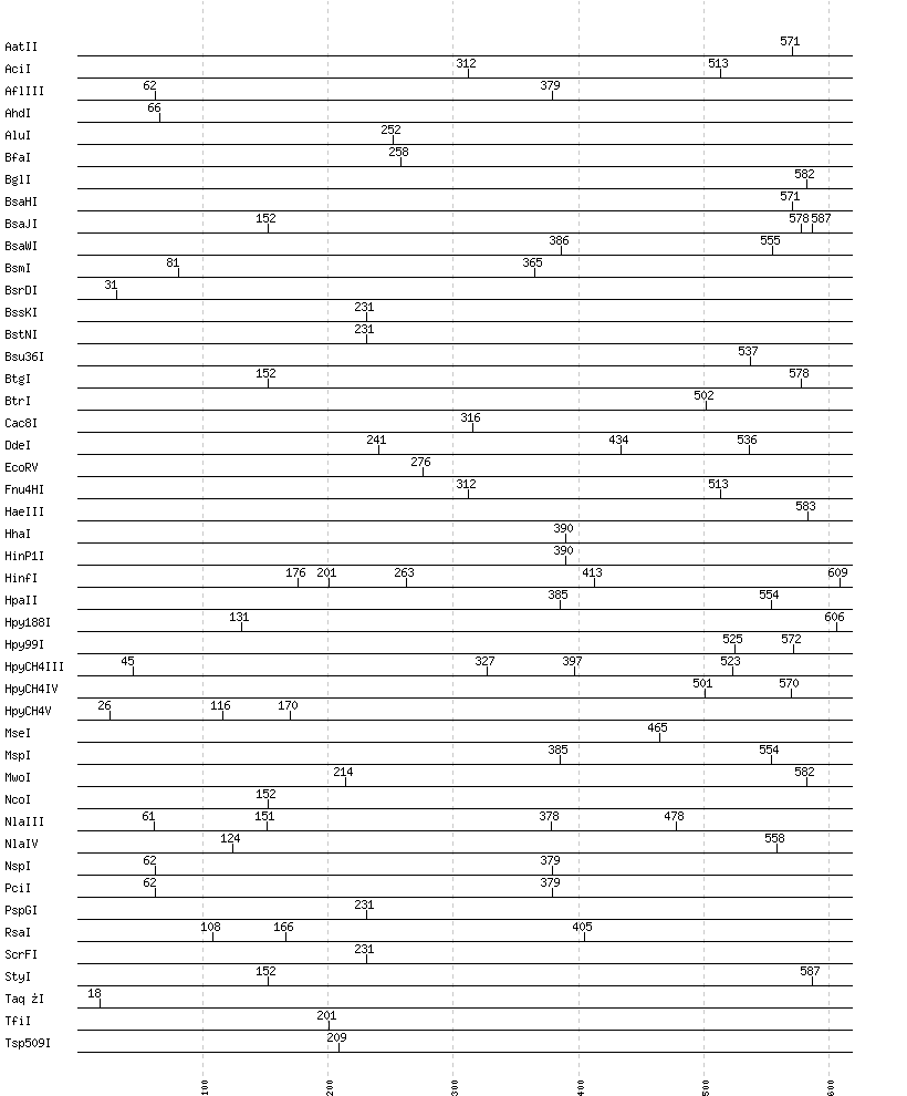 Uncut enzymes: Acc65I, AccI, AccII(FnuDII), AccIII(BspMII), AclI, AfeI, AflII, AgeI, AlwI, AlwNI, Aor51HI(Eco47III), ApaI, ApaLI, ApoI, AscI, AseI, AvaI, AvaII, AvrII, BaeI, BalI, BamHI, BanI, BanII, BbsI, BbvCI, BbvI, BcgI, BciVI, BclI, BglII, BlpI, BmrI, BpmI, BsaAI, BsaBI, BsaI, BsaXI, BseRI, BsgI, BsiEI, BsiHKAI, BsiWI, BslI, BsmAI, BsmBI, BsmFI, BsoBI, Bsp1286I, BspDI, BspEI, BspHI, BspMI, BspT107I(HgiCI), BsrBI, BsrFI, BsrGI, BsrI, BssHII, BssSI, BstAPI, BstBI, BstEII, BstF5I, BstUI, BstXI, BstYI, BstZ17I, BtsI, Cfr10I, ClaI, DpnI, DpnII, DraI, DraIII, DrdI, EaeI, EagI, EarI, EciI, EcoNI, EcoO109I, EcoRI, FauI, FokI, FseI, FspI, HaeII, HgaI, HincII, HindIII, HpaI, HphI, I-CeuI, I-SceI, KasI, KpnI, MboI, MboII, MfeI, MluI, MlyI, MnlI, MscI, MslI, MspA1I, N.BstNBI, NaeI, , NarI, NciI, NdeI, NgoMIV, NheI, NotI, NruI, NsiI, PI-PspI, PI-SceI(VDE), PacI, PaeR7I, PflFI, PflMI, PleI, PmeI, PmlI, PpuMI, PshAI, PsiI, PspOMI, PstI, PvuI, PvuII, RsrII, SacI, SacII, SalI, SapI, Sau3AI, Sau96I, SbfI, ScaI, SexAI, SfaNI, SfcI, SfiI, SfoI, SgrAI, SmaI, SmlI, SnaBI, SpeI, SphI, SspI, StuI, SwaI, TliI, TseI, Tsp45I, TspRI, Tth111I, XbaI, XcmI, XhoI, XmaI, XmnI
