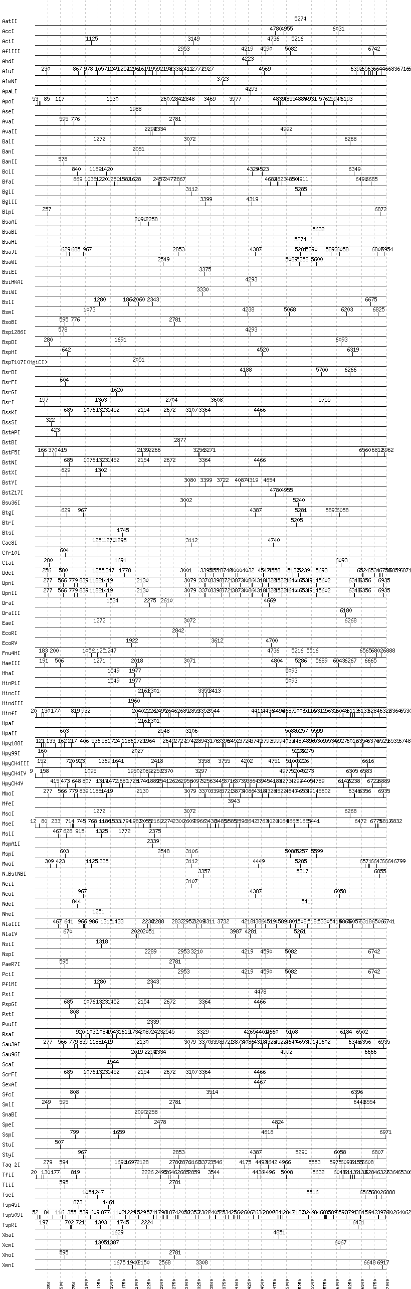 Uncut enzymes: Acc65I, AccII(FnuDII), AccIII(BspMII), AclI, AfeI, AflII, AgeI, AlwI, Aor51HI(Eco47III), ApaI, AscI, AvrII, BaeI, BamHI, BbsI, BbvCI, BbvI, BcgI, BciVI, BmrI, BpmI, BsaI, BsaXI, BseRI, BsgI, BsmAI, BsmBI, BsmFI, BspEI, BspMI, BsrBI, BssHII, BstEII, BstUI, DrdI, EagI, EarI, EciI, EcoNI, EcoO109I, FauI, FokI, FseI, FspI, HaeII, HgaI, HphI, I-CeuI, I-SceI, KasI, KpnI, MboII, MluI, MlyI, MnlI, NaeI, , NarI, NgoMIV, NotI, NruI, PI-PspI, PI-SceI(VDE), PacI, PflFI, PleI, PmeI, PmlI, PpuMI, PshAI, PspOMI, PvuI, RsrII, SacI, SacII, SalI, SapI, SbfI, SfaNI, SfiI, SfoI, SgrAI, SmaI, SphI, SwaI, Tth111I, XmaI