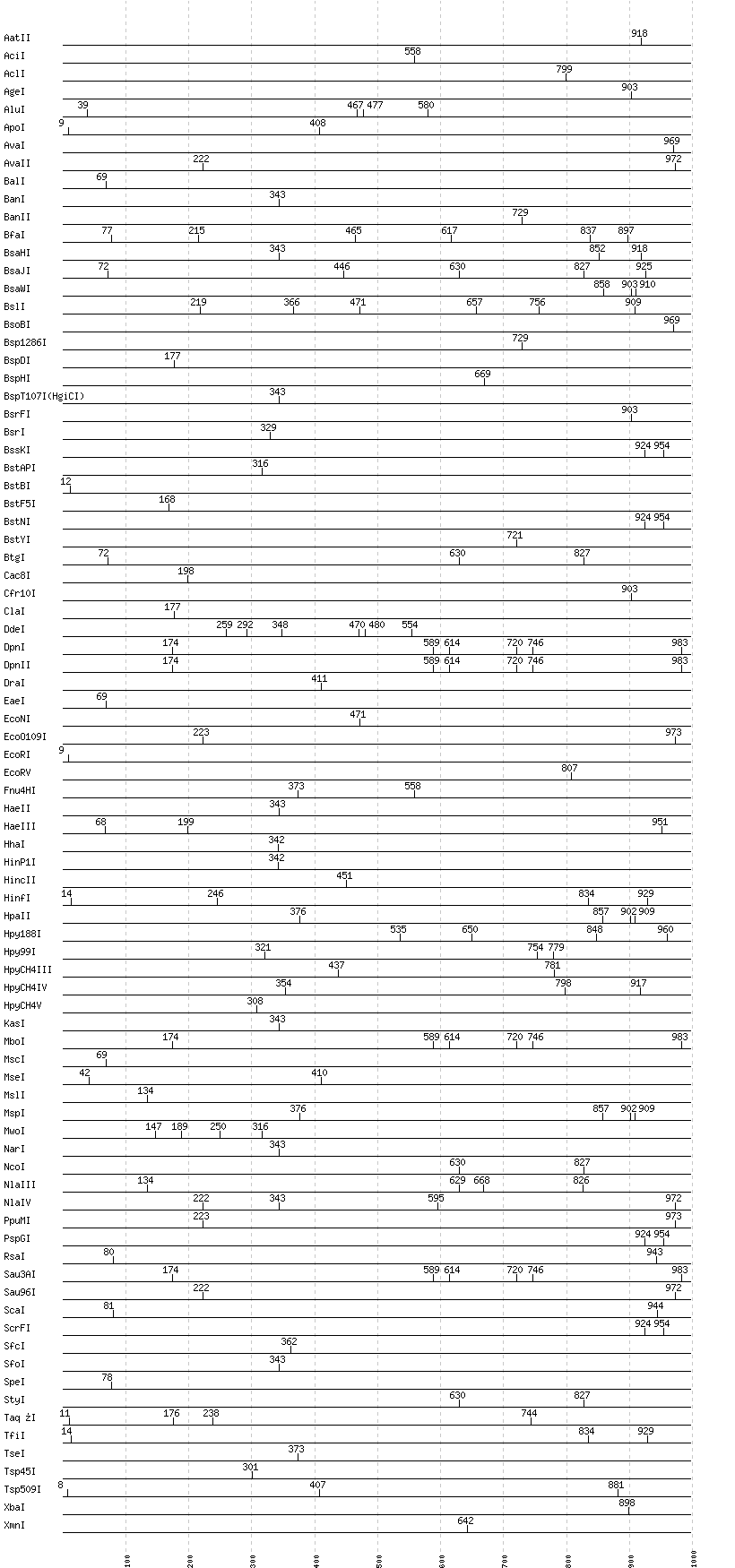 Uncut enzymes: Acc65I, AccI, AccII(FnuDII), AccIII(BspMII), AfeI, AflII, AflIII, AhdI, AlwI, AlwNI, Aor51HI(Eco47III), ApaI, ApaLI, AscI, AseI, AvrII, BaeI, BamHI, BbsI, BbvCI, BbvI, BcgI, BciVI, BclI, BglI, BglII, BlpI, BmrI, BpmI, BsaAI, BsaBI, BsaI, BsaXI, BseRI, BsgI, BsiEI, BsiHKAI, BsiWI, BsmAI, BsmBI, BsmFI, BsmI, BspEI, BspMI, BsrBI, BsrDI, BsrGI, BssHII, BssSI, BstEII, BstUI, BstXI, BstZ17I, Bsu36I, BtrI, BtsI, DraIII, DrdI, EagI, EarI, EciI, FauI, FokI, FseI, FspI, HgaI, HindIII, HpaI, HphI, I-CeuI, I-SceI, KpnI, MboII, MfeI, MluI, MlyI, MnlI, MspA1I, N.BstNBI, NaeI, , NciI, NdeI, NgoMIV, NheI, NotI, NruI, NsiI, NspI, PI-PspI, PI-SceI(VDE), PacI, PaeR7I, PciI, PflFI, PflMI, PleI, PmeI, PmlI, PshAI, PsiI, PspOMI, PstI, PvuI, PvuII, RsrII, SacI, SacII, SalI, SapI, SbfI, SexAI, SfaNI, SfiI, SgrAI, SmaI, SmlI, SnaBI, SphI, SspI, StuI, SwaI, TliI, TspRI, Tth111I, XcmI, XhoI, XmaI