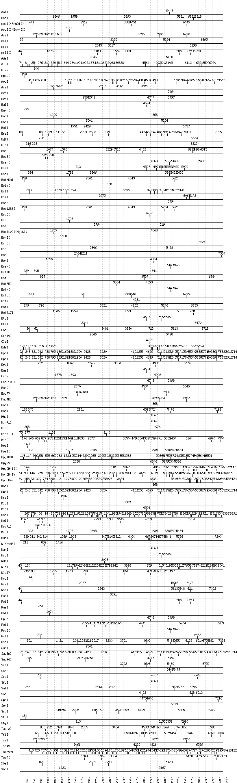 Uncut enzymes: Acc65I, AfeI, AhdI, AlwI, Aor51HI(Eco47III), ApaI, AscI, AvrII, BaeI, BbsI, BbvCI, BbvI, BcgI, BciVI, BglI, BmrI, BpmI, BsaI, BsaXI, BseRI, BsgI, BsiEI, BsmAI, BsmBI, BsmFI, BspMI, BssHII, BssSI, BstEII, Bsu36I, BtrI, DraIII, DrdI, EagI, EarI, EciI, FauI, FokI, FseI, FspI, HgaI, HphI, I-CeuI, I-SceI, KpnI, MboII, MlyI, MnlI, NaeI, , NciI, NgoMIV, NheI, NotI, PI-PspI, PI-SceI(VDE), PaeR7I, PflFI, PflMI, PleI, PshAI, PspOMI, PvuI, PvuII, RsrII, SacII, SalI, SapI, SbfI, SexAI, SfaNI, SfiI, SgrAI, SmaI, SwaI, TliI, Tth111I, XcmI, XhoI, XmaI