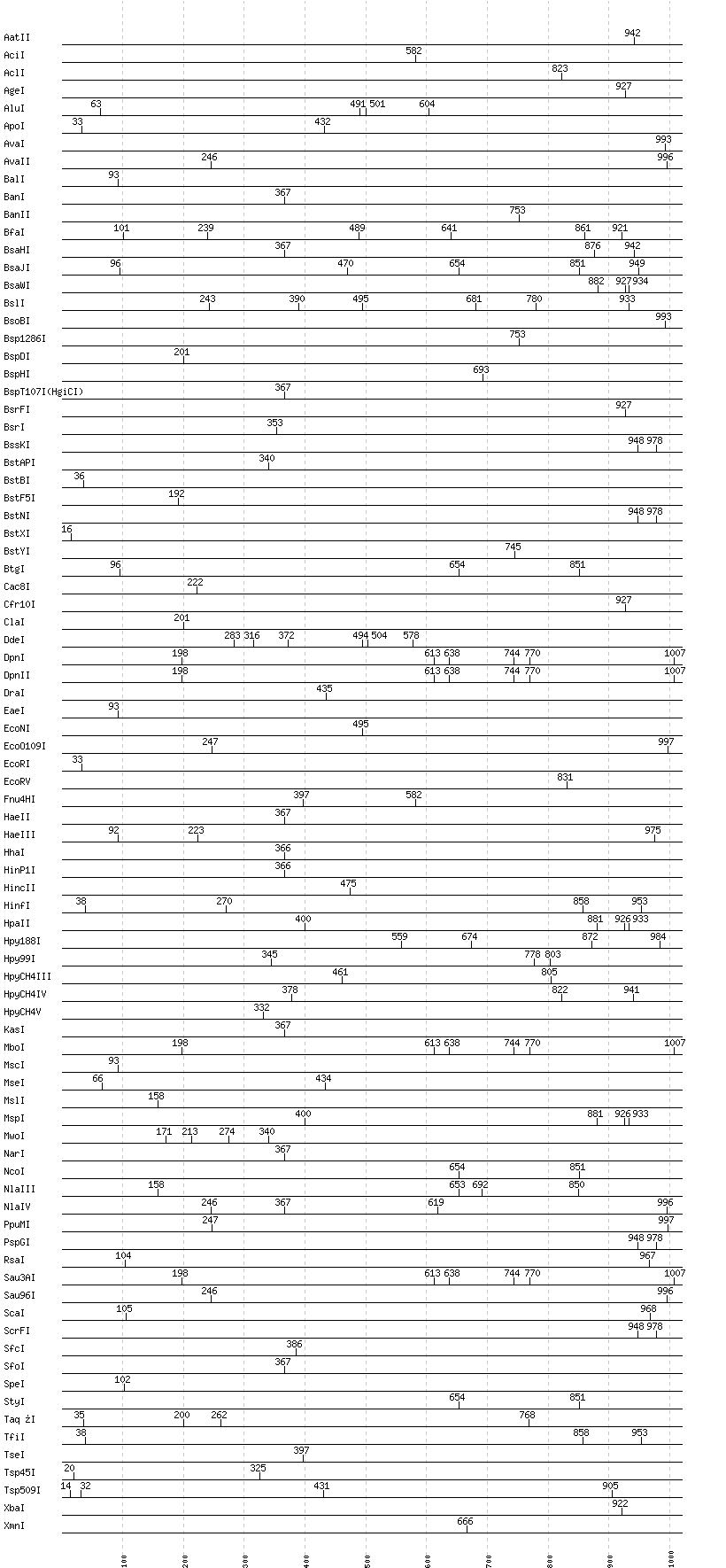 Uncut enzymes: Acc65I, AccI, AccIII(BspMII), AfeI, AflII, AflIII, AgeI, AhdI, AlwI, AlwNI, Aor51HI(Eco47III), ApaI, ApaLI, AscI, AseI, AvaII, AvrII, BaeI, BalI, BamHI, BbsI, BbvCI, BbvI, BcgI, BciVI, BclI, BglI, BlpI, BmrI, BpmI, BsaBI, BsaI, BsaXI, BseRI, BsgI, BsiEI, BsiWI, BslI, BsmAI, BsmBI, BsmFI, BsmI, BspDI, BspEI, BspHI, BspMI, BsrBI, BsrDI, BsrFI, BsrI, BssHII, BstAPI, BstEII, BstNI, BstXI, BstZ17I, Bsu36I, BtgI, BtrI, BtsI, Cac8I, Cfr10I, ClaI, DraI, DraIII, DrdI, EaeI, EagI, EarI, EciI, EcoNI, EcoO109I, EcoRV, FauI, FokI, FseI, FspI, HaeII, HaeIII, HgaI, HphI, HpyCH4V, I-CeuI, I-SceI, KasI, KpnI, MboII, MfeI, MluI, MlyI, MnlI, MscI, MslI, MspA1I, N.BstNBI, NaeI, , NarI, NcoI, NdeI, NgoMIV, NheI, NotI, NruI, NsiI, NspI, PI-PspI, PI-SceI(VDE), PacI, PaeR7I, PciI, PflMI, PleI, PmeI, PmlI, PpuMI, PshAI, PspGI, PspOMI, PstI, PvuI, PvuII, RsrII, SacII, SalI, SapI, Sau96I, SbfI, SexAI, SfaNI, SfcI, SfiI, SfoI, SgrAI, SmaI, SmlI, SnaBI, SpeI, SphI, SspI, StuI, StyI, SwaI, TliI, TseI, XbaI, XhoI, XmaI, XmnI