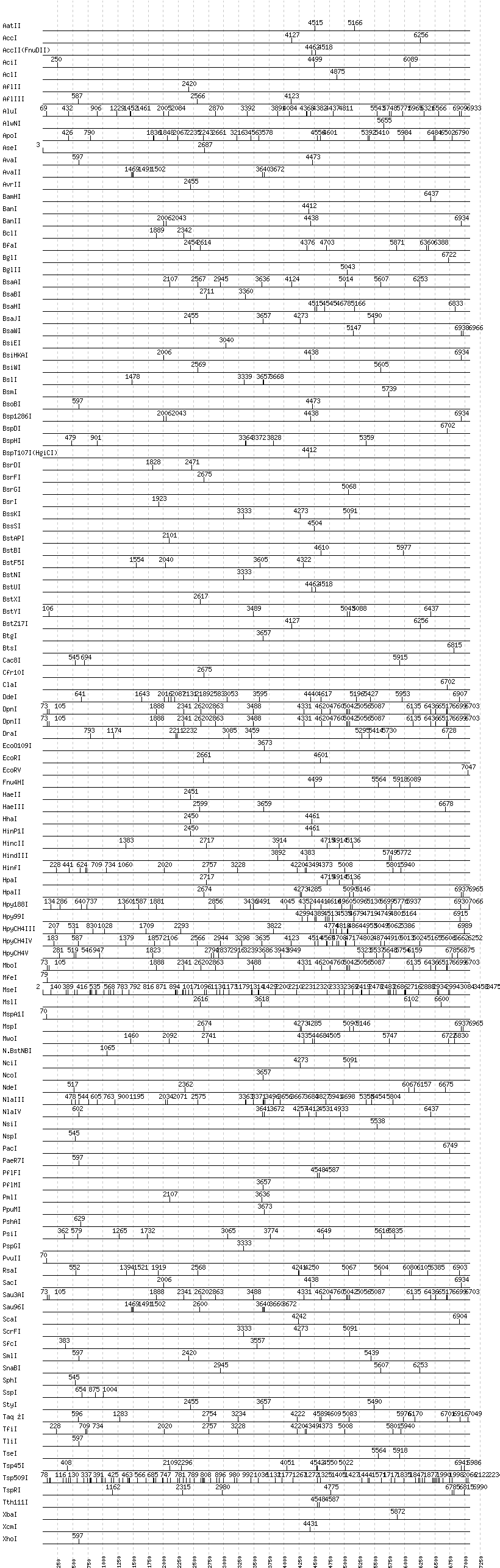 Uncut enzymes: Acc65I, AccIII(BspMII), AfeI, AgeI, AhdI, AlwI, Aor51HI(Eco47III), ApaI, ApaLI, AscI, BaeI, BalI, BbsI, BbvCI, BbvI, BcgI, BciVI, BlpI, BmrI, BpmI, BsaI, BsaXI, BseRI, BsgI, BsmAI, BsmBI, BsmFI, BspEI, BspMI, BsrBI, BssHII, BstEII, Bsu36I, BtrI, DraIII, DrdI, EaeI, EagI, EarI, EciI, EcoNI, FauI, FokI, FseI, FspI, HgaI, HphI, I-CeuI, I-SceI, KasI, KpnI, MboII, MluI, MlyI, MnlI, MscI, NaeI, , NarI, NgoMIV, NheI, NotI, NruI, PI-PspI, PI-SceI(VDE), PciI, PleI, PmeI, PspOMI, PstI, PvuI, RsrII, SacII, SalI, SapI, SbfI, SexAI, SfaNI, SfiI, SfoI, SgrAI, SmaI, SpeI, StuI, SwaI, XmaI, XmnI