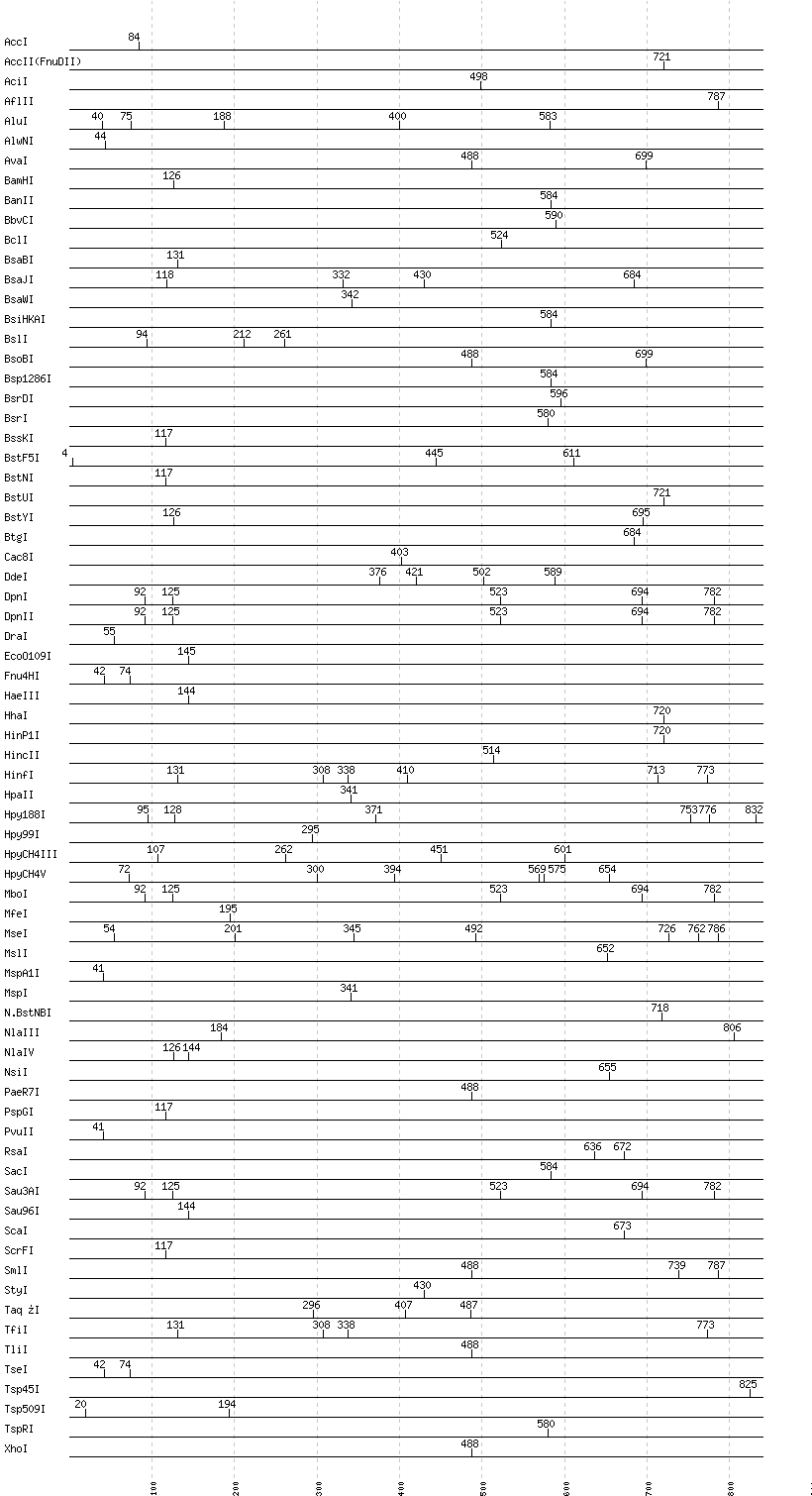 Uncut enzymes: AatII, Acc65I, AccIII(BspMII), AclI, AfeI, AflIII, AgeI, AhdI, AlwI, Aor51HI(Eco47III), ApaI, ApaLI, ApoI, AscI, AseI, AvaII, AvrII, BaeI, BalI, BanI, BbsI, BbvI, BcgI, BciVI, BfaI, BglI, BglII, BlpI, BmrI, BpmI, BsaAI, BsaHI, BsaI, BsaXI, BseRI, BsgI, BsiEI, BsiWI, BsmAI, BsmBI, BsmFI, BsmI, BspDI, BspEI, BspHI, BspMI, BspT107I(HgiCI), BsrBI, BsrFI, BsrGI, BssHII, BssSI, BstAPI, BstBI, BstEII, BstXI, BstZ17I, Bsu36I, BtrI, BtsI, Cfr10I, ClaI, DraIII, DrdI, EaeI, EagI, EarI, EciI, EcoNI, EcoRI, EcoRV, FauI, FokI, FseI, FspI, HaeII, HgaI, HindIII, HpaI, HphI, HpyCH4IV, I-CeuI, I-SceI, KasI, KpnI, MboII, MluI, MlyI, MnlI, MscI, MwoI, NaeI, , NarI, NciI, NcoI, NdeI, NgoMIV, NheI, NotI, NruI, NspI, PI-PspI, PI-SceI(VDE), PacI, PciI, PflFI, PflMI, PleI, PmeI, PmlI, PpuMI, PshAI, PsiI, PspOMI, PstI, PvuI, RsrII, SacII, SalI, SapI, SbfI, SexAI, SfaNI, SfcI, SfiI, SfoI, SgrAI, SmaI, SnaBI, SpeI, SphI, SspI, StuI, SwaI, Tth111I, XbaI, XcmI, XmaI, XmnI