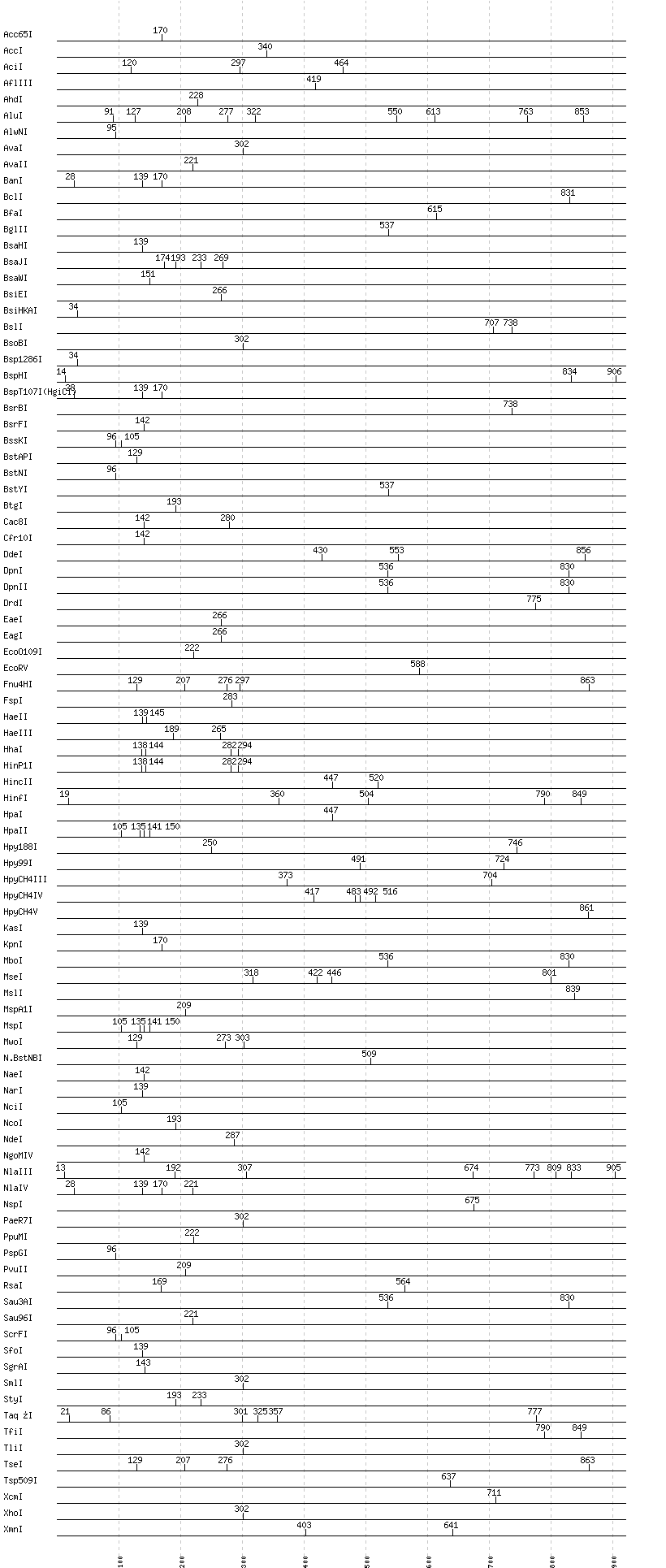 Uncut enzymes: AatII, AccII(FnuDII), AccIII(BspMII), AclI, AfeI, AflII, AgeI, AlwI, Aor51HI(Eco47III), ApaI, ApaLI, ApoI, AscI, AseI, AvrII, BaeI, BalI, BamHI, BanII, BbsI, BbvCI, BbvI, BcgI, BciVI, BglI, BlpI, BmrI, BpmI, BsaAI, BsaBI, BsaI, BsaXI, BseRI, BsgI, BsiWI, BsmAI, BsmBI, BsmFI, BsmI, BspDI, BspEI, BspMI, BsrDI, BsrGI, BsrI, BssHII, BssSI, BstBI, BstEII, BstF5I, BstUI, BstXI, BstZ17I, Bsu36I, BtrI, BtsI, ClaI, DraI, DraIII, EarI, EciI, EcoNI, EcoRI, FauI, FokI, FseI, HgaI, HindIII, HphI, I-CeuI, I-SceI, MboII, MfeI, MluI, MlyI, MnlI, MscI, , NheI, NotI, NruI, NsiI, PI-PspI, PI-SceI(VDE), PacI, PciI, PflFI, PflMI, PleI, PmeI, PmlI, PshAI, PsiI, PspOMI, PstI, PvuI, RsrII, SacI, SacII, SalI, SapI, SbfI, ScaI, SexAI, SfaNI, SfcI, SfiI, SmaI, SnaBI, SpeI, SphI, SspI, StuI, SwaI, Tsp45I, TspRI, Tth111I, XbaI, XmaI
