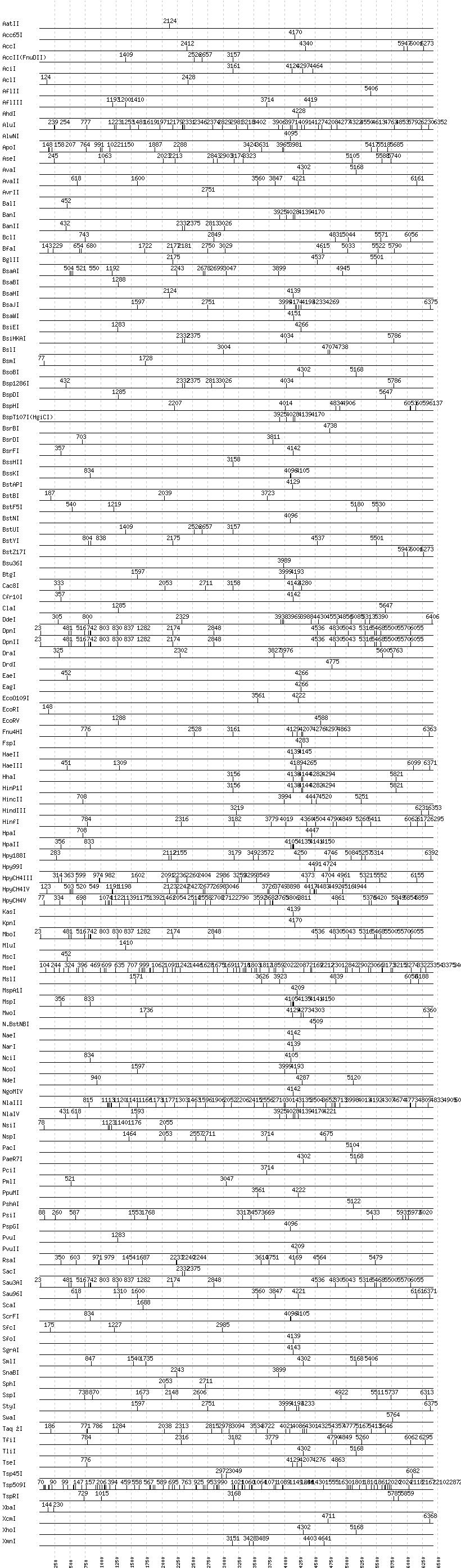 Uncut enzymes: AccIII(BspMII), AfeI, AgeI, AlwI, Aor51HI(Eco47III), ApaI, ApaLI, AscI, BaeI, BamHI, BbsI, BbvCI, BbvI, BcgI, BciVI, BglI, BlpI, BmrI, BpmI, BsaI, BsaXI, BseRI, BsgI, BsiWI, BsmAI, BsmBI, BsmFI, BspEI, BspMI, BsrGI, BsrI, BssSI, BstEII, BstXI, BtrI, BtsI, DraIII, EarI, EciI, EcoNI, FauI, FokI, FseI, HgaI, HphI, I-CeuI, I-SceI, MboII, MfeI, MlyI, MnlI, , NheI, NotI, NruI, PI-PspI, PI-SceI(VDE), PflFI, PflMI, PleI, PmeI, PspOMI, PstI, RsrII, SacII, SalI, SapI, SbfI, SexAI, SfaNI, SfiI, SmaI, SpeI, StuI, Tth111I, XmaI