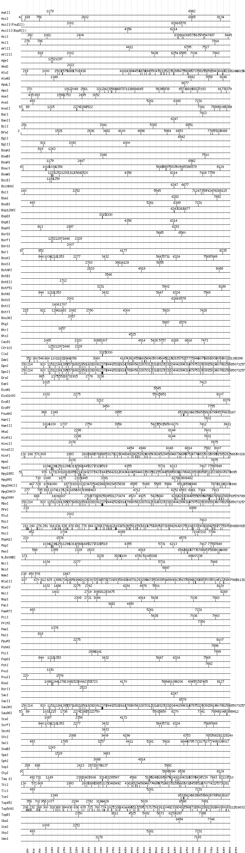Uncut enzymes: Acc65I, AfeI, AlwI, Aor51HI(Eco47III), ApaI, AscI, AvrII, BaeI, BamHI, BanI, BbsI, BbvCI, BbvI, BcgI, BciVI, BlpI, BmrI, BpmI, BsaI, BsaXI, BseRI, BsgI, BsiWI, BsmAI, BsmBI, BsmFI, BspMI, BspT107I(HgiCI), BsrBI, BssHII, BstZ17I, DraIII, DrdI, EagI, EarI, EciI, FauI, FokI, FseI, FspI, HgaI, HphI, I-CeuI, I-SceI, KasI, KpnI, MboII, MlyI, MnlI, NaeI, , NarI, NgoMIV, NheI, NotI, NruI, PI-PspI, PI-SceI(VDE), PflFI, PleI, PspOMI, SalI, SapI, SbfI, SfaNI, SfiI, SfoI, SgrAI, SmaI, StuI, SwaI, Tth111I, XmaI