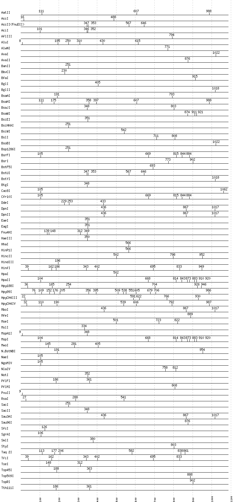 Uncut enzymes: Acc65I, AccIII(BspMII), AclI, AfeI, AflII, AgeI, AhdI, AlwI, Aor51HI(Eco47III), ApaI, ApaLI, ApoI, AscI, AseI, AvrII, BaeI, BalI, BamHI, BanI, BbsI, BbvI, BcgI, BciVI, BclI, BlpI, BmrI, BpmI, BsaBI, BsaI, BsaXI, BseRI, BsgI, BsmAI, BsmBI, BsmFI, BsmI, BspDI, BspEI, BspHI, BspMI, BspT107I(HgiCI), BsrBI, BsrDI, BsrGI, BssHII, BssKI, BssSI, BstAPI, BstBI, BstEII, BstNI, BstXI, BstZ17I, Bsu36I, BtrI, BtsI, ClaI, DraI, DraIII, DrdI, EarI, EciI, EcoNI, EcoO109I, EcoRI, EcoRV, FauI, FokI, FseI, FspI, HaeII, HgaI, HphI, HpyCH4V, I-CeuI, I-SceI, KasI, KpnI, MboII, MluI, MlyI, MnlI, MscI, , NarI, NciI, NcoI, NdeI, NheI, NlaIII, NruI, NsiI, NspI, PI-PspI, PI-SceI(VDE), PacI, PaeR7I, PciI, PleI, PmeI, PmlI, PpuMI, PshAI, PsiI, PspGI, PspOMI, PstI, PvuI, RsrII, SalI, SapI, SbfI, ScaI, ScrFI, SexAI, SfaNI, SfiI, SfoI, SmaI, SnaBI, SpeI, SphI, SspI, StuI, SwaI, TliI, XbaI, XcmI, XhoI, XmaI, XmnI