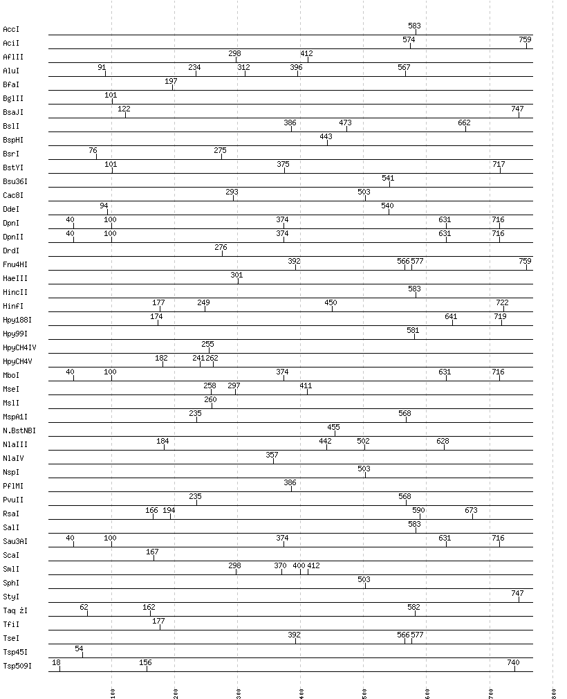 Uncut enzymes: AatII, Acc65I, AccII(FnuDII), AccIII(BspMII), AclI, AfeI, AflIII, AgeI, AhdI, AlwI, AlwNI, Aor51HI(Eco47III), ApaI, ApaLI, ApoI, AscI, AseI, AvaI, AvaII, AvrII, BaeI, BalI, BamHI, BanI, BanII, BbsI, BbvCI, BbvI, BcgI, BciVI, BclI, BglI, BlpI, BmrI, BpmI, BsaAI, BsaBI, BsaHI, BsaI, BsaWI, BsaXI, BseRI, BsgI, BsiEI, BsiHKAI, BsiWI, BsmAI, BsmBI, BsmFI, BsmI, BsoBI, Bsp1286I, BspDI, BspEI, BspMI, BspT107I(HgiCI), BsrBI, BsrDI, BsrFI, BsrGI, BssHII, BssKI, BssSI, BstAPI, BstBI, BstEII, BstF5I, BstNI, BstUI, BstXI, BstZ17I, BtgI, BtrI, BtsI, Cfr10I, ClaI, DraI, DraIII, EaeI, EagI, EarI, EciI, EcoNI, EcoO109I, EcoRI, EcoRV, FauI, FokI, FseI, FspI, HaeII, HgaI, HhaI, HinP1I, HindIII, HpaI, HpaII, HphI, HpyCH4III, I-CeuI, I-SceI, KasI, KpnI, MboII, MfeI, MluI, MlyI, MnlI, MscI, MspI, MwoI, NaeI, , NarI, NciI, NcoI, NdeI, NgoMIV, NheI, NotI, NruI, NsiI, PI-PspI, PI-SceI(VDE), PacI, PaeR7I, PciI, PflFI, PleI, PmeI, PmlI, PpuMI, PshAI, PsiI, PspGI, PspOMI, PstI, PvuI, RsrII, SacI, SacII, SapI, Sau96I, SbfI, ScrFI, SexAI, SfaNI, SfcI, SfiI, SfoI, SgrAI, SmaI, SnaBI, SpeI, SspI, StuI, SwaI, TliI, TspRI, Tth111I, XbaI, XcmI, XhoI, XmaI, XmnI