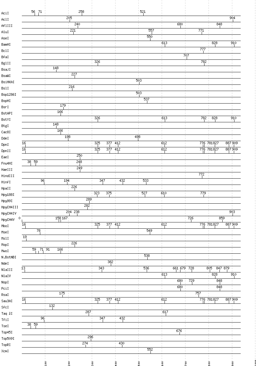 Uncut enzymes: AatII, Acc65I, AccI, AccII(FnuDII), AccIII(BspMII), AfeI, AflII, AgeI, AhdI, AlwI, AlwNI, Aor51HI(Eco47III), ApaI, ApaLI, ApoI, AscI, AvaI, AvaII, AvrII, BaeI, BalI, BanI, BanII, BbsI, BbvCI, BbvI, BcgI, BciVI, BglI, BlpI, BmrI, BpmI, BsaAI, BsaBI, BsaHI, BsaI, BsaXI, BseRI, BsgI, BsiEI, BsiWI, BsmAI, BsmBI, BsmFI, BsmI, BsoBI, BspDI, BspEI, BspMI, BspT107I(HgiCI), BsrBI, BsrDI, BsrFI, BsrGI, BssHII, BssKI, BssSI, BstBI, BstEII, BstF5I, BstNI, BstUI, BstXI, BstZ17I, Bsu36I, BtrI, BtsI, Cfr10I, ClaI, DraI, DraIII, DrdI, EagI, EarI, EciI, EcoNI, EcoO109I, EcoRI, EcoRV, FauI, FokI, FseI, FspI, HaeII, HgaI, HhaI, HinP1I, HincII, HpaI, HphI, I-CeuI, I-SceI, KasI, KpnI, MboII, MfeI, MluI, MlyI, MnlI, MscI, MspA1I, NaeI, , NarI, NciI, NcoI, NgoMIV, NheI, NotI, NruI, NsiI, PI-PspI, PI-SceI(VDE), PacI, PaeR7I, PflFI, PflMI, PleI, PmeI, PmlI, PpuMI, PshAI, PsiI, PspGI, PspOMI, PstI, PvuI, PvuII, RsrII, SacI, SacII, SalI, SapI, Sau96I, SbfI, ScaI, ScrFI, SexAI, SfaNI, SfiI, SfoI, SgrAI, SmaI, SmlI, SnaBI, SpeI, SphI, SspI, StuI, StyI, SwaI, TliI, Tth111I, XbaI, XhoI, XmaI, XmnI