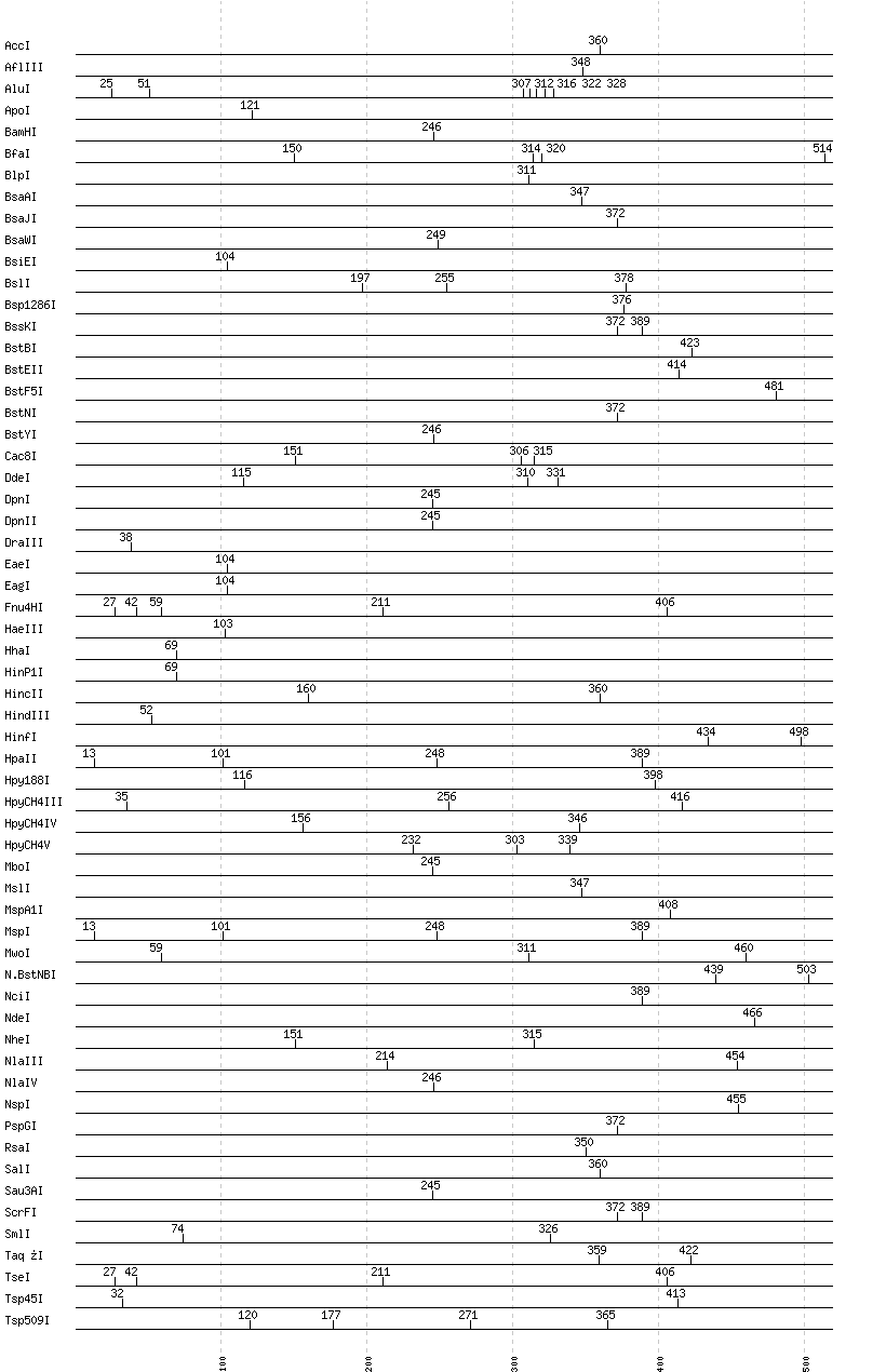 Uncut enzymes: AatII, Acc65I, AccII(FnuDII), AccIII(BspMII), AciI, AclI, AfeI, AflII, AgeI, AhdI, AlwI, AlwNI, Aor51HI(Eco47III), ApaI, ApaLI, AscI, AseI, AvaI, AvaII, AvrII, BaeI, BalI, BanI, BanII, BbsI, BbvCI, BbvI, BcgI, BciVI, BclI, BglI, BglII, BmrI, BpmI, BsaBI, BsaHI, BsaI, BsaXI, BseRI, BsgI, BsiHKAI, BsiWI, BsmAI, BsmBI, BsmFI, BsmI, BsoBI, BspDI, BspEI, BspHI, BspMI, BspT107I(HgiCI), BsrBI, BsrDI, BsrFI, BsrGI, BsrI, BssHII, BssSI, BstAPI, BstUI, BstXI, BstZ17I, Bsu36I, BtgI, BtrI, BtsI, Cfr10I, ClaI, DraI, DrdI, EarI, EciI, EcoNI, EcoO109I, EcoRI, EcoRV, FauI, FokI, FseI, FspI, HaeII, HgaI, HpaI, HphI, Hpy99I, I-CeuI, I-SceI, KasI, KpnI, MboII, MfeI, MluI, MlyI, MnlI, MscI, MseI, NaeI, , NarI, NcoI, NgoMIV, NotI, NruI, NsiI, PI-PspI, PI-SceI(VDE), PacI, PaeR7I, PciI, PflFI, PflMI, PleI, PmeI, PmlI, PpuMI, PshAI, PsiI, PspOMI, PstI, PvuI, PvuII, RsrII, SacI, SacII, SapI, Sau96I, SbfI, ScaI, SexAI, SfaNI, SfcI, SfiI, SfoI, SgrAI, SmaI, SnaBI, SpeI, SphI, SspI, StuI, StyI, SwaI, TfiI, TliI, TspRI, Tth111I, XbaI, XcmI, XhoI, XmaI, XmnI