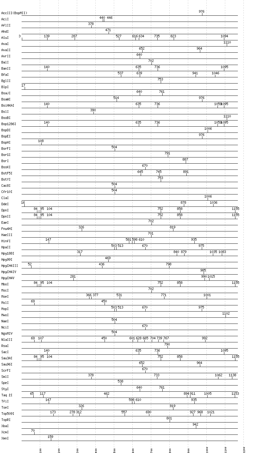 Uncut enzymes: AatII, Acc65I, AccI, AccII(FnuDII), AclI, AfeI, AflIII, AgeI, AlwI, AlwNI, Aor51HI(Eco47III), ApaI, ApaLI, ApoI, AscI, AseI, BaeI, BamHI, BanI, BbsI, BbvCI, BbvI, BcgI, BciVI, BclI, BglI, BmrI, BpmI, BsaAI, BsaBI, BsaHI, BsaI, BsaXI, BseRI, BsgI, BsiEI, BsiWI, BsmAI, BsmBI, BsmFI, BsmI, BspMI, BspT107I(HgiCI), BsrBI, BsrDI, BssHII, BssSI, BstAPI, BstBI, BstEII, BstNI, BstUI, BstXI, BstZ17I, Bsu36I, BtgI, BtrI, BtsI, DraI, DraIII, DrdI, EagI, EarI, EciI, EcoNI, EcoO109I, EcoRI, EcoRV, FauI, FokI, FseI, FspI, HaeII, HgaI, HhaI, HinP1I, HincII, HindIII, HpaI, HphI, I-CeuI, I-SceI, KasI, KpnI, MboII, MfeI, MluI, MlyI, MnlI, MspA1I, N.BstNBI, , NarI, NcoI, NdeI, NheI, NlaIV, NotI, NruI, NsiI, NspI, PI-PspI, PI-SceI(VDE), PacI, PaeR7I, PciI, PflFI, PflMI, PleI, PmeI, PmlI, PpuMI, PshAI, PsiI, PspGI, PspOMI, PstI, PvuI, PvuII, RsrII, SacII, SalI, SapI, SbfI, ScaI, SexAI, SfaNI, SfcI, SfiI, SfoI, SgrAI, SmaI, SnaBI, SphI, SspI, StuI, SwaI, TliI, Tsp45I, Tth111I, XhoI, XmaI