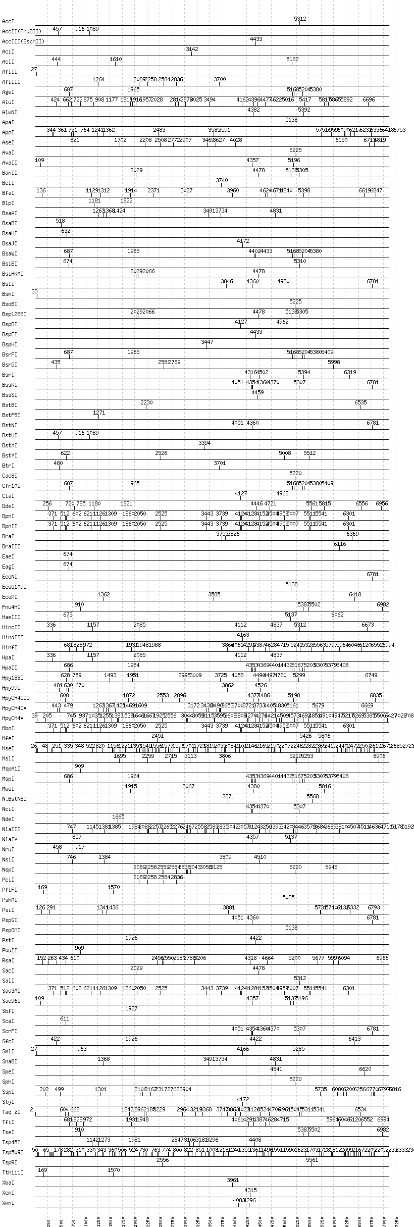 Uncut enzymes: AatII, Acc65I, AfeI, AhdI, AlwI, Aor51HI(Eco47III), ApaLI, AscI, AvrII, BaeI, BalI, BamHI, BanI, BbsI, BbvCI, BbvI, BcgI, BciVI, BglI, BglII, BmrI, BpmI, BsaI, BsaXI, BseRI, BsgI, BsiWI, BsmAI, BsmBI, BsmFI, BspMI, BspT107I(HgiCI), BsrBI, BsrDI, BssHII, BstAPI, BstEII, BstZ17I, Bsu36I, BtgI, BtsI, DrdI, EarI, EciI, EcoRV, FauI, FokI, FseI, FspI, HaeII, HgaI, HhaI, HinP1I, HphI, I-CeuI, I-SceI, KasI, KpnI, MboII, MluI, MlyI, MnlI, MscI, NaeI, , NarI, NcoI, NgoMIV, NheI, NotI, PI-PspI, PI-SceI(VDE), PacI, PaeR7I, PflMI, PleI, PmeI, PmlI, PpuMI, PvuI, RsrII, SacII, SapI, SexAI, SfaNI, SfiI, SfoI, SgrAI, SmaI, StuI, SwaI, TliI, XhoI, XmaI
