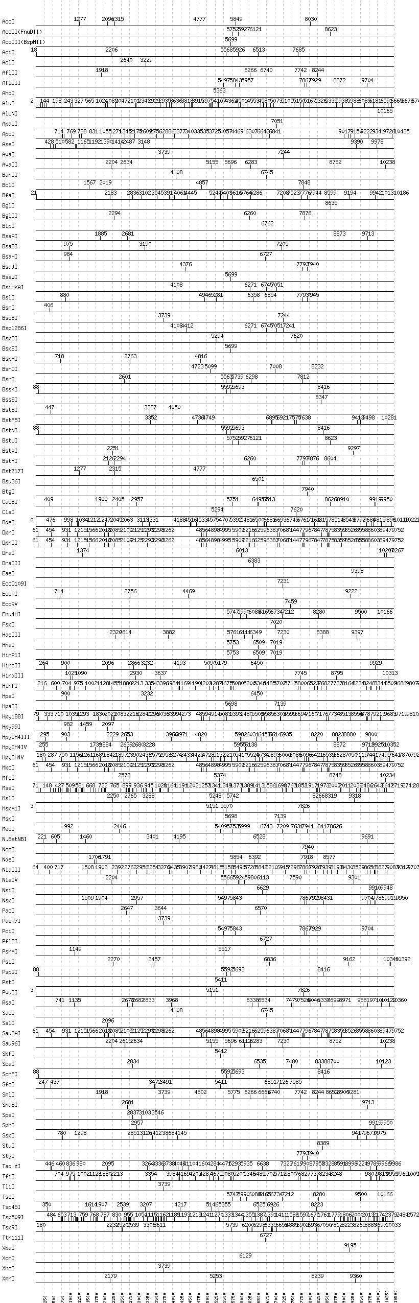 Uncut enzymes: AatII, Acc65I, AfeI, AgeI, AlwI, Aor51HI(Eco47III), ApaI, AscI, AvrII, BaeI, BalI, BamHI, BanI, BbsI, BbvCI, BbvI, BcgI, BciVI, BmrI, BpmI, BsaI, BsaXI, BseRI, BsgI, BsiEI, BsiWI, BsmAI, BsmBI, BsmFI, BspMI, BspT107I(HgiCI), BsrBI, BsrFI, BsrGI, BssHII, BstAPI, BstEII, BtrI, BtsI, Cfr10I, DrdI, EagI, EarI, EciI, EcoNI, FauI, FokI, FseI, HaeII, HgaI, HphI, I-CeuI, I-SceI, KasI, KpnI, MboII, MluI, MlyI, MnlI, MscI, NaeI, , NarI, NciI, NgoMIV, NheI, NotI, NruI, PI-PspI, PI-SceI(VDE), PflMI, PleI, PmeI, PmlI, PpuMI, PspOMI, PvuI, RsrII, SacII, SapI, SexAI, SfaNI, SfiI, SfoI, SgrAI, SmaI, SwaI, XmaI