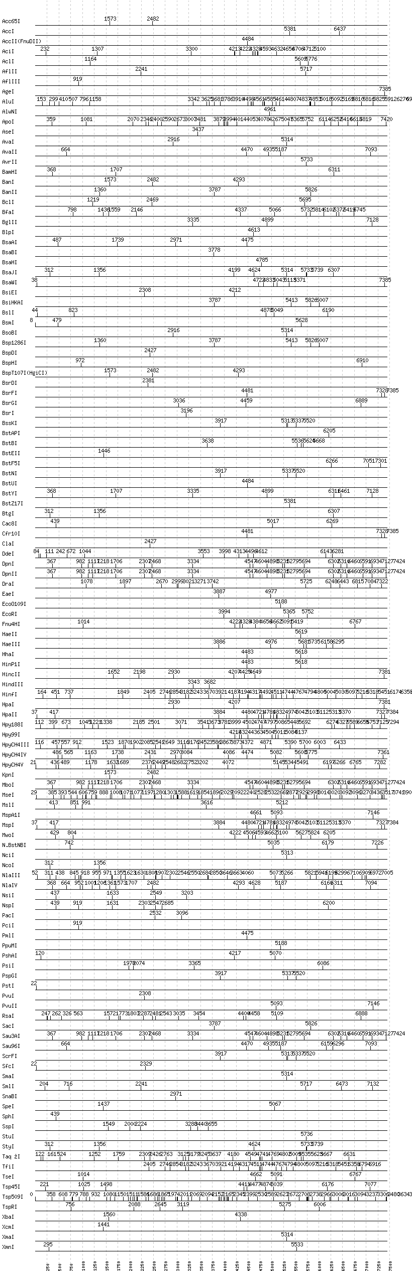 Uncut enzymes: AatII, AccIII(BspMII), AfeI, AhdI, AlwI, Aor51HI(Eco47III), ApaI, ApaLI, AscI, BaeI, BalI, BbsI, BbvCI, BbvI, BcgI, BciVI, BglI, BmrI, BpmI, BsaI, BsaXI, BseRI, BsgI, BsiWI, BsmAI, BsmBI, BsmFI, BspEI, BspMI, BsrBI, BssHII, BssSI, BstXI, Bsu36I, BtrI, BtsI, DraIII, DrdI, EagI, EarI, EciI, EcoNI, EcoRV, FauI, FokI, FseI, FspI, HgaI, HphI, I-CeuI, I-SceI, KasI, MboII, MfeI, MluI, MlyI, MnlI, MscI, NaeI, , NarI, NdeI, NgoMIV, NheI, NotI, NruI, PI-PspI, PI-SceI(VDE), PaeR7I, PflFI, PflMI, PleI, PmeI, PspOMI, RsrII, SacII, SalI, SapI, SbfI, ScaI, SexAI, SfaNI, SfiI, SfoI, SgrAI, SwaI, TliI, Tth111I, XhoI