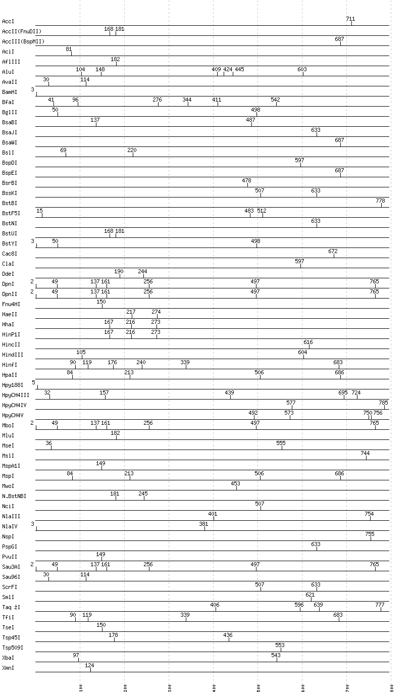 Uncut enzymes: AatII, Acc65I, AclI, AfeI, AflII, AgeI, AhdI, AlwI, AlwNI, Aor51HI(Eco47III), ApaI, ApaLI, ApoI, AscI, AseI, AvaI, AvrII, BaeI, BalI, BanI, BanII, BbsI, BbvCI, BbvI, BcgI, BciVI, BclI, BglI, BlpI, BmrI, BpmI, BsaAI, BsaHI, BsaI, BsaXI, BseRI, BsgI, BsiEI, BsiHKAI, BsiWI, BsmAI, BsmBI, BsmFI, BsmI, BsoBI, Bsp1286I, BspHI, BspMI, BspT107I(HgiCI), BsrDI, BsrFI, BsrGI, BsrI, BssHII, BssSI, BstAPI, BstEII, BstXI, BstZ17I, Bsu36I, BtgI, BtrI, BtsI, Cfr10I, DraI, DraIII, DrdI, EaeI, EagI, EarI, EciI, EcoNI, EcoO109I, EcoRI, EcoRV, FauI, FokI, FseI, FspI, HaeIII, HgaI, HpaI, HphI, Hpy99I, I-CeuI, I-SceI, KasI, KpnI, MboII, MfeI, MlyI, MnlI, MscI, NaeI, , NarI, NcoI, NdeI, NgoMIV, NheI, NotI, NruI, NsiI, PI-PspI, PI-SceI(VDE), PacI, PaeR7I, PciI, PflFI, PflMI, PleI, PmeI, PmlI, PpuMI, PshAI, PsiI, PspOMI, PstI, PvuI, RsaI, RsrII, SacI, SacII, SalI, SapI, SbfI, ScaI, SexAI, SfaNI, SfcI, SfiI, SfoI, SgrAI, SmaI, SnaBI, SpeI, SphI, SspI, StuI, StyI, SwaI, TliI, TspRI, Tth111I, XcmI, XhoI, XmaI