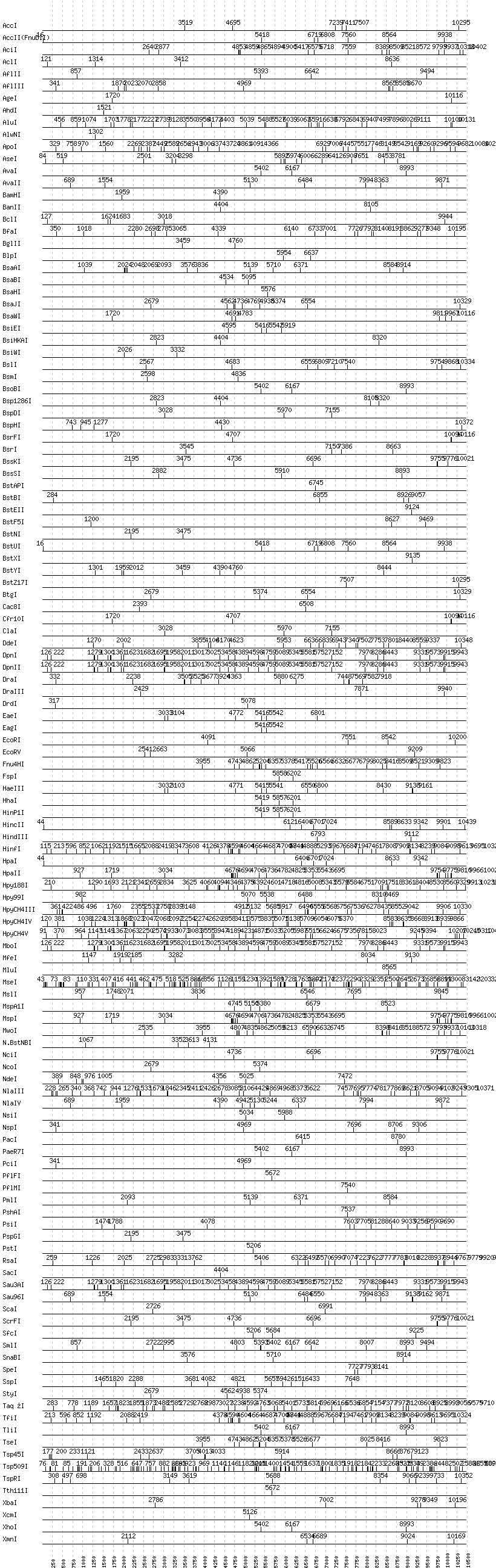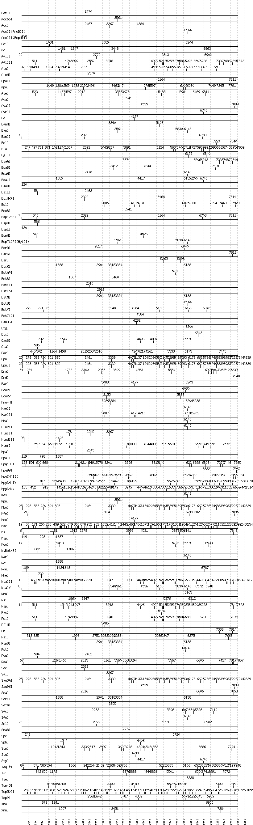 Uncut enzymes: AfeI, AgeI, AhdI, AlwI, Aor51HI(Eco47III), ApaI, AscI, BaeI, BbsI, BbvCI, BbvI, BcgI, BciVI, BglI, BlpI, BmrI, BpmI, BsaI, BsaXI, BseRI, BsgI, BsiWI, BsmAI, BsmBI, BsmFI, BsmI, BspMI, BsrBI, BsrFI, BssHII, BssSI, BstXI, BtrI, Cfr10I, DraIII, EagI, EarI, EciI, EcoNI, EcoO109I, FauI, FokI, FseI, FspI, HgaI, HphI, I-CeuI, I-SceI, MboII, MluI, MlyI, MnlI, MspA1I, NaeI, , NcoI, NgoMIV, NotI, PI-PspI, PI-SceI(VDE), PaeR7I, PflFI, PleI, PmeI, PpuMI, PshAI, PspOMI, PvuII, RsrII, SacII, SapI, SbfI, SfaNI, SfiI, SgrAI, SmaI, SwaI, TliI, Tth111I, XcmI, XhoI, XmaI
