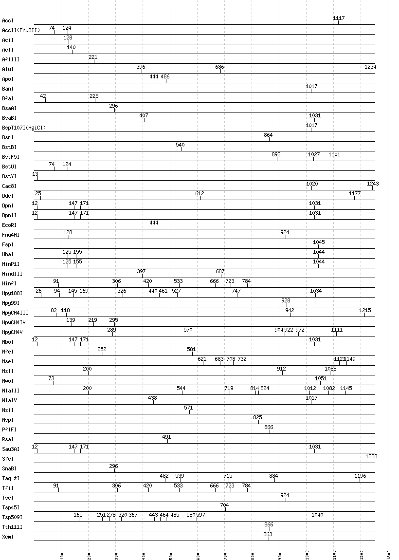 Uncut enzymes: AatII, Acc65I, AccIII(BspMII), AfeI, AflII, AgeI, AhdI, AlwI, AlwNI, Aor51HI(Eco47III), ApaI, ApaLI, AscI, AseI, AvaI, AvaII, AvrII, BaeI, BalI, BamHI, BanII, BbsI, BbvCI, BbvI, BcgI, BciVI, BclI, BglI, BglII, BlpI, BmrI, BpmI, BsaHI, BsaI, BsaJI, BsaWI, BsaXI, BseRI, BsgI, BsiEI, BsiHKAI, BsiWI, BslI, BsmAI, BsmBI, BsmFI, BsmI, BsoBI, Bsp1286I, BspDI, BspEI, BspHI, BspMI, BsrBI, BsrDI, BsrFI, BsrGI, BssHII, BssKI, BssSI, BstAPI, BstEII, BstNI, BstXI, BstZ17I, Bsu36I, BtgI, BtrI, BtsI, Cfr10I, ClaI, DraI, DraIII, DrdI, EaeI, EagI, EarI, EciI, EcoNI, EcoO109I, EcoRV, FauI, FokI, FseI, HaeII, HaeIII, HgaI, HincII, HpaI, HpaII, HphI, I-CeuI, I-SceI, KasI, KpnI, MboII, MluI, MlyI, MnlI, MscI, MspA1I, MspI, N.BstNBI, NaeI, , NarI, NciI, NcoI, NdeI, NgoMIV, NheI, NotI, NruI, PI-PspI, PI-SceI(VDE), PacI, PaeR7I, PciI, PflMI, PleI, PmeI, PmlI, PpuMI, PshAI, PsiI, PspGI, PspOMI, PstI, PvuI, PvuII, RsrII, SacI, SacII, SalI, SapI, Sau96I, SbfI, ScaI, ScrFI, SexAI, SfaNI, SfiI, SfoI, SgrAI, SmaI, SmlI, SpeI, SphI, SspI, StuI, StyI, SwaI, TliI, TspRI, XbaI, XhoI, XmaI, XmnI