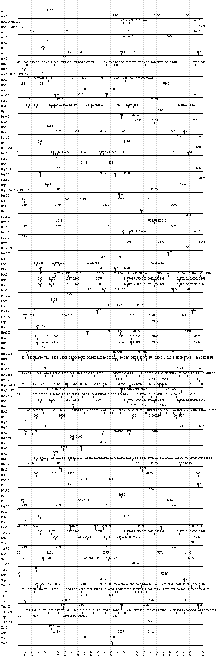 Uncut enzymes: Acc65I, AgeI, AlwI, ApaI, ApaLI, AscI, AvrII, BaeI, BalI, BamHI, BanII, BbsI, BbvCI, BbvI, BcgI, BciVI, BclI, BglI, BlpI, BmrI, BpmI, BsaI, BsaXI, BseRI, BsgI, BsiWI, BsmAI, BsmBI, BsmFI, BspMI, BsrDI, BsrFI, BsrGI, BssHII, BssSI, BstAPI, BtrI, BtsI, Cfr10I, DrdI, EaeI, EagI, EarI, EciI, EcoO109I, FauI, FokI, FseI, HgaI, HphI, I-CeuI, I-SceI, KasI, KpnI, MboII, MluI, MlyI, MnlI, MscI, NaeI, , NarI, NciI, NgoMIV, NotI, NruI, PI-PspI, PI-SceI(VDE), PacI, PflMI, PleI, PmeI, PpuMI, PshAI, PspOMI, RsrII, SacI, SacII, SalI, SapI, SbfI, SexAI, SfaNI, SfiI, SfoI, SgrAI, SmaI, SpeI, StuI, SwaI, XmaI