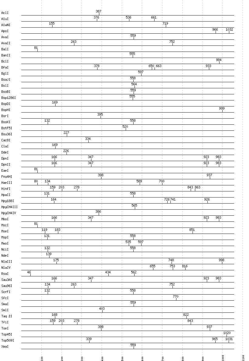 Uncut enzymes: AatII, Acc65I, AccI, AccII(FnuDII), AccIII(BspMII), AciI, AfeI, AflII, AflIII, AgeI, AhdI, AlwI, Aor51HI(Eco47III), ApaI, ApaLI, AscI, AseI, AvrII, BaeI, BamHI, BanI, BbsI, BbvCI, BbvI, BcgI, BciVI, BglII, BlpI, BmrI, BpmI, BsaAI, BsaBI, BsaHI, BsaI, BsaWI, BsaXI, BseRI, BsgI, BsiEI, BsiHKAI, BsiWI, BsmAI, BsmBI, BsmFI, BsmI, BspEI, BspMI, BspT107I(HgiCI), BsrBI, BsrDI, BsrFI, BsrGI, BssHII, BssSI, BstAPI, BstBI, BstEII, BstNI, BstUI, BstXI, BstYI, BstZ17I, BtgI, BtrI, BtsI, Cfr10I, DraI, DraIII, DrdI, EagI, EarI, EciI, EcoNI, EcoO109I, EcoRI, EcoRV, FauI, FokI, FseI, FspI, HaeII, HgaI, HhaI, HinP1I, HincII, HindIII, HpaI, HphI, Hpy99I, HpyCH4V, I-CeuI, I-SceI, KasI, KpnI, MboII, MfeI, MluI, MlyI, MnlI, MslI, MspA1I, N.BstNBI, NaeI, , NarI, NcoI, NgoMIV, NheI, NotI, NruI, NsiI, NspI, PI-PspI, PI-SceI(VDE), PacI, PaeR7I, PciI, PflFI, PflMI, PleI, PmeI, PmlI, PpuMI, PshAI, PsiI, PspGI, PspOMI, PstI, PvuI, PvuII, RsrII, SacI, SacII, SalI, SapI, SbfI, ScaI, SexAI, SfaNI, SfiI, SfoI, SgrAI, SnaBI, SpeI, SphI, SspI, StuI, StyI, SwaI, TliI, TspRI, Tth111I, XbaI, XcmI, XhoI, XmnI