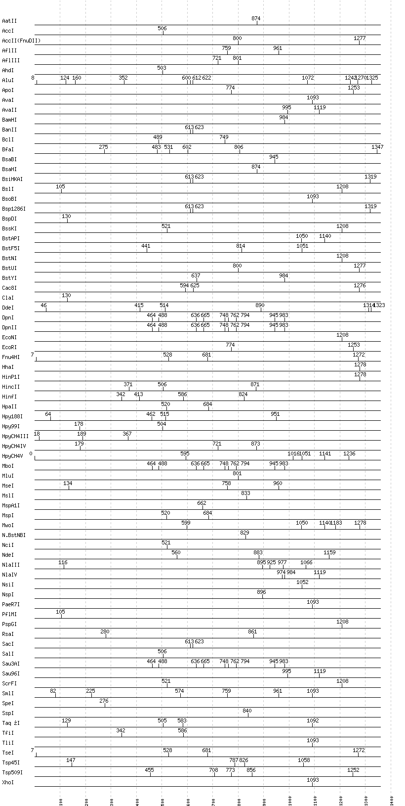 Uncut enzymes: Acc65I, AccIII(BspMII), AciI, AclI, AfeI, AgeI, AlwI, AlwNI, Aor51HI(Eco47III), ApaI, ApaLI, AscI, AseI, AvrII, BaeI, BalI, BanI, BbsI, BbvCI, BbvI, BcgI, BciVI, BglI, BglII, BlpI, BmrI, BpmI, BsaAI, BsaI, BsaJI, BsaWI, BsaXI, BseRI, BsgI, BsiEI, BsiWI, BsmAI, BsmBI, BsmFI, BsmI, BspEI, BspHI, BspMI, BspT107I(HgiCI), BsrBI, BsrDI, BsrFI, BsrGI, BsrI, BssHII, BssSI, BstBI, BstEII, BstXI, BstZ17I, Bsu36I, BtgI, BtrI, BtsI, Cfr10I, DraI, DraIII, DrdI, EaeI, EagI, EarI, EciI, EcoO109I, EcoRV, FauI, FokI, FseI, FspI, HaeII, HaeIII, HgaI, HindIII, HpaI, HphI, I-CeuI, I-SceI, KasI, KpnI, MboII, MfeI, MlyI, MnlI, MscI, NaeI, , NarI, NcoI, NgoMIV, NheI, NotI, NruI, PI-PspI, PI-SceI(VDE), PacI, PciI, PflFI, PleI, PmeI, PmlI, PpuMI, PshAI, PsiI, PspOMI, PstI, PvuI, PvuII, RsrII, SacII, SapI, SbfI, ScaI, SexAI, SfaNI, SfcI, SfiI, SfoI, SgrAI, SmaI, SnaBI, SphI, StuI, StyI, SwaI, TspRI, Tth111I, XbaI, XcmI, XmaI, XmnI