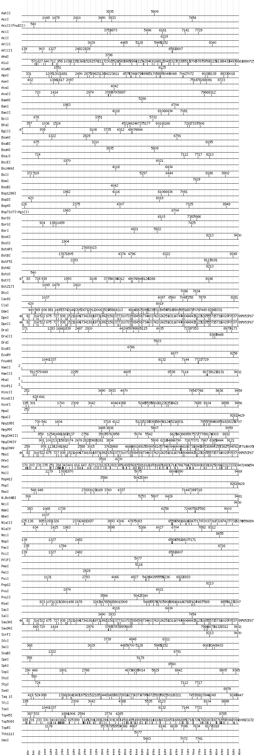 Uncut enzymes: Acc65I, AccIII(BspMII), AfeI, AgeI, AlwI, Aor51HI(Eco47III), ApaI, ApaLI, AscI, AvrII, BaeI, BalI, BbsI, BbvCI, BbvI, BcgI, BciVI, BglI, BlpI, BmrI, BpmI, BsaI, BsaWI, BsaXI, BseRI, BsgI, BsiWI, BsmAI, BsmBI, BsmFI, BspEI, BspMI, BsrBI, BsrFI, BssHII, BstEII, BstXI, Bsu36I, BtgI, BtrI, Cfr10I, EaeI, EagI, EarI, EciI, EcoNI, EcoO109I, FauI, FokI, FseI, FspI, HgaI, HphI, I-CeuI, I-SceI, KasI, KpnI, MboII, MluI, MlyI, MnlI, MscI, NaeI, , NarI, NcoI, NgoMIV, NotI, NruI, PI-PspI, PI-SceI(VDE), PaeR7I, PflMI, PleI, PpuMI, PshAI, PspOMI, PstI, RsrII, SacII, SapI, SbfI, ScaI, SexAI, SfaNI, SfiI, SfoI, SgrAI, SmaI, TliI, XbaI, XcmI, XhoI, XmaI