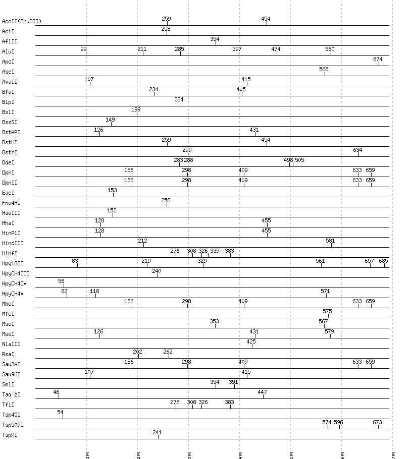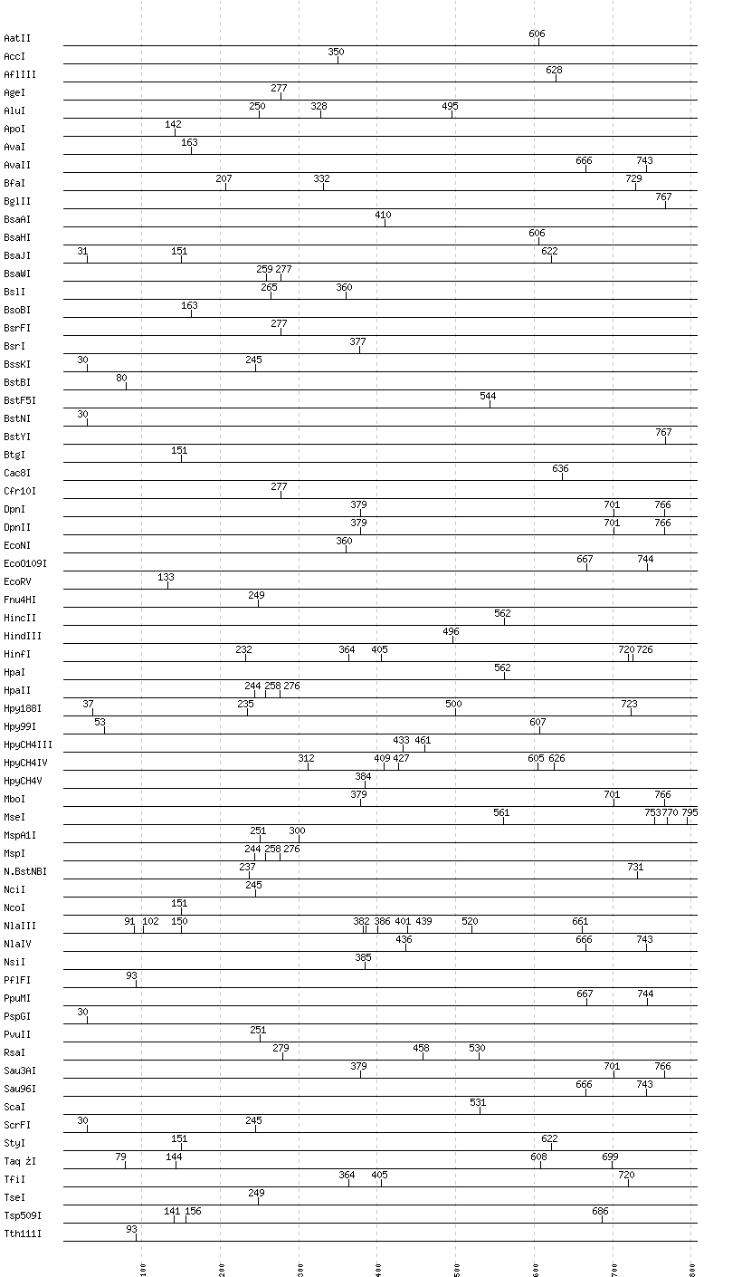 Uncut enzymes: Acc65I, AccII(FnuDII), AccIII(BspMII), AciI, AclI, AfeI, AflII, AhdI, AlwI, AlwNI, Aor51HI(Eco47III), ApaI, ApaLI, AscI, AseI, AvrII, BaeI, BalI, BamHI, BanI, BanII, BbsI, BbvCI, BbvI, BcgI, BciVI, BclI, BglI, BlpI, BmrI, BpmI, BsaBI, BsaI, BsaXI, BseRI, BsgI, BsiEI, BsiHKAI, BsiWI, BsmAI, BsmBI, BsmFI, BsmI, Bsp1286I, BspDI, BspEI, BspHI, BspMI, BspT107I(HgiCI), BsrBI, BsrDI, BsrGI, BssHII, BssSI, BstAPI, BstEII, BstUI, BstXI, BstZ17I, Bsu36I, BtrI, BtsI, ClaI, DdeI, DraI, DraIII, DrdI, EaeI, EagI, EarI, EciI, EcoRI, FauI, FokI, FseI, FspI, HaeII, HaeIII, HgaI, HhaI, HinP1I, HphI, I-CeuI, I-SceI, KasI, KpnI, MboII, MfeI, MluI, MlyI, MnlI, MscI, MslI, MwoI, NaeI, , NarI, NdeI, NgoMIV, NheI, NotI, NruI, NspI, PI-PspI, PI-SceI(VDE), PacI, PaeR7I, PciI, PflMI, PleI, PmeI, PmlI, PshAI, PsiI, PspOMI, PstI, PvuI, RsrII, SacI, SacII, SalI, SapI, SbfI, SexAI, SfaNI, SfcI, SfiI, SfoI, SgrAI, SmaI, SmlI, SnaBI, SpeI, SphI, SspI, StuI, SwaI, TliI, Tsp45I, TspRI, XbaI, XcmI, XhoI, XmaI, XmnI