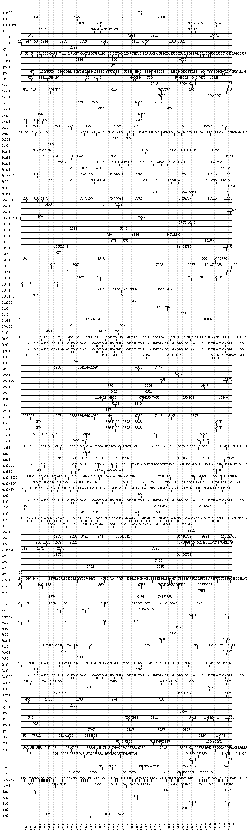 Uncut enzymes: AatII, AccIII(BspMII), AclI, AfeI, AhdI, AlwI, Aor51HI(Eco47III), ApaI, AscI, BaeI, BbsI, BbvCI, BbvI, BcgI, BciVI, BglI, BmrI, BpmI, BsaHI, BsaI, BsaXI, BseRI, BsgI, BsiEI, BsiWI, BsmAI, BsmBI, BsmFI, BspEI, BspMI, BsrBI, BssHII, BssSI, BstEII, BtsI, DraIII, EagI, EarI, EciI, FauI, FokI, FseI, HgaI, HphI, I-CeuI, I-SceI, KasI, MboII, MluI, MlyI, MnlI, NaeI, , NarI, NgoMIV, NotI, PI-PspI, PI-SceI(VDE), PflFI, PflMI, PleI, PshAI, PspOMI, PvuI, PvuII, RsrII, SacII, SalI, SapI, SbfI, SexAI, SfaNI, SfiI, SfoI, SphI, StuI, SwaI, Tth111I
