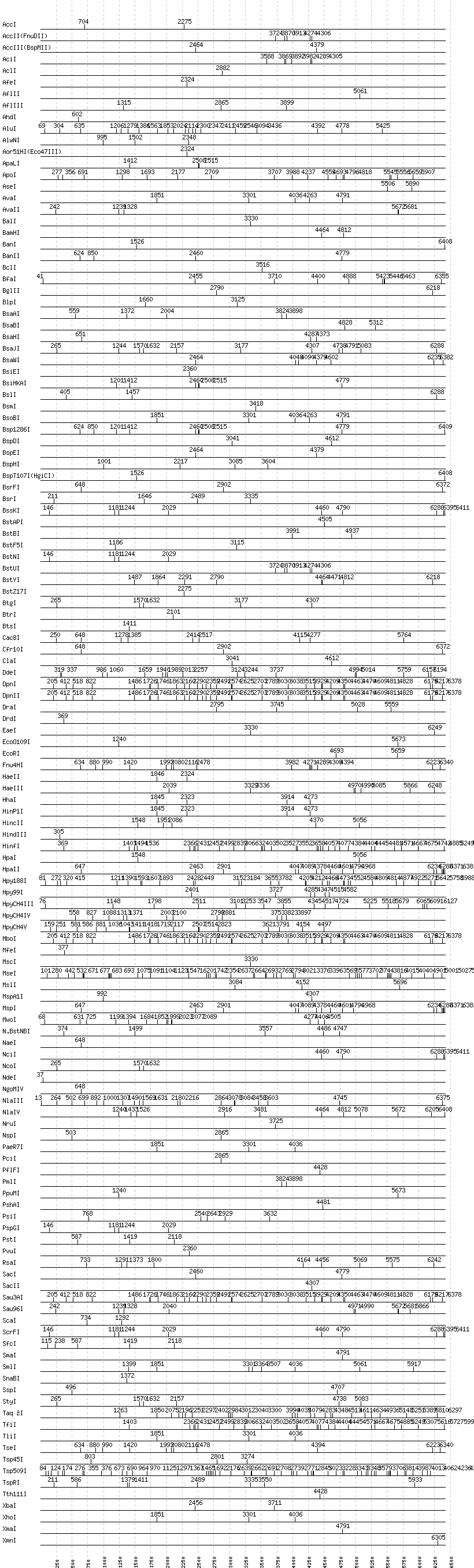 Uncut enzymes: AatII, Acc65I, AgeI, AlwI, ApaI, AscI, AvrII, BaeI, BbsI, BbvCI, BbvI, BcgI, BciVI, BglI, BmrI, BpmI, BsaI, BsaXI, BseRI, BsgI, BsiWI, BsmAI, BsmBI, BsmFI, BspMI, BsrBI, BsrDI, BsrGI, BssHII, BssSI, BstEII, BstXI, Bsu36I, DraIII, EagI, EarI, EciI, EcoNI, EcoRV, FauI, FokI, FseI, FspI, HgaI, HphI, I-CeuI, I-SceI, KasI, KpnI, MboII, MluI, MlyI, MnlI, , NarI, NheI, NotI, NsiI, PI-PspI, PI-SceI(VDE), PacI, PflMI, PleI, PmeI, PspOMI, PvuII, RsrII, SalI, SapI, SbfI, SexAI, SfaNI, SfiI, SfoI, SgrAI, SpeI, SphI, StuI, SwaI, XcmI