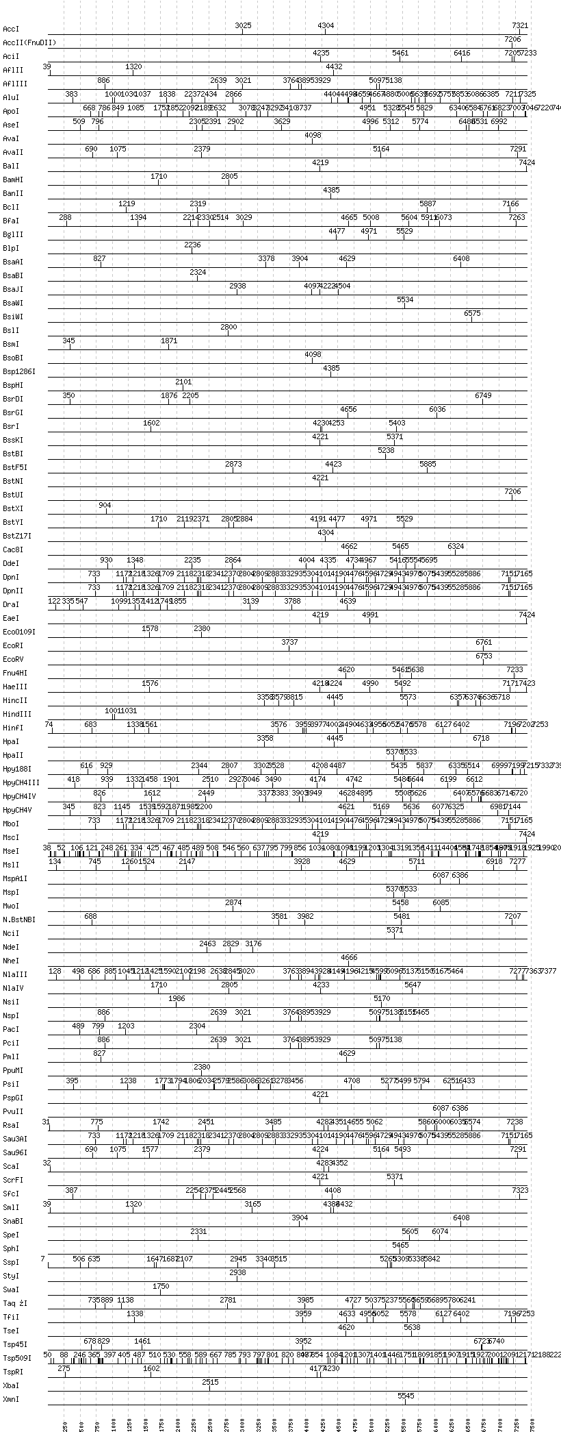 Uncut enzymes: AatII, Acc65I, AccIII(BspMII), AclI, AfeI, AlwI, AlwNI, Aor51HI(Eco47III), ApaI, ApaLI, AscI, AvrII, BaeI, BalI, BamHI, BanI, BbsI, BbvCI, BbvI, BcgI, BciVI, BglI, BmrI, BpmI, BsaI, BsaXI, BseRI, BsgI, BsiWI, BsmAI, BsmBI, BsmFI, BsmI, BspEI, BspMI, BspT107I(HgiCI), BsrBI, BsrDI, BssHII, BstAPI, BtrI, BtsI, EagI, EarI, EciI, EcoNI, EcoRI, FauI, FokI, FseI, FspI, HgaI, HpaI, HphI, I-CeuI, I-SceI, KasI, KpnI, MboII, MluI, MlyI, MnlI, MscI, MspA1I, N.BstNBI, NaeI, , NarI, NgoMIV, NheI, NotI, PI-PspI, PI-SceI(VDE), PflFI, PleI, PmlI, PpuMI, PshAI, PspOMI, PvuI, PvuII, RsrII, SacII, SalI, SapI, SexAI, SfaNI, SfiI, SfoI, SgrAI, SmaI, SphI, SwaI, Tth111I, XbaI, XmaI