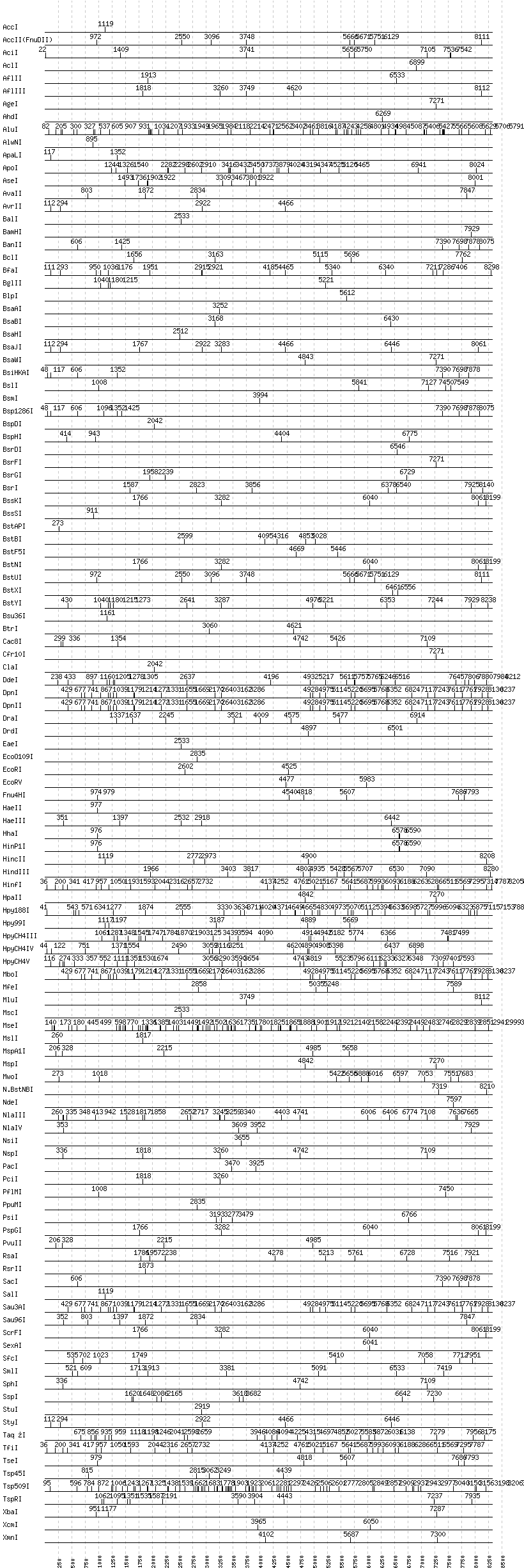 Uncut enzymes: AatII, Acc65I, AccIII(BspMII), AfeI, AlwI, Aor51HI(Eco47III), ApaI, AscI, AvaI, BaeI, BanI, BbsI, BbvCI, BbvI, BcgI, BciVI, BglI, BmrI, BpmI, BsaI, BsaXI, BseRI, BsgI, BsiEI, BsiWI, BsmAI, BsmBI, BsmFI, BsoBI, BspEI, BspMI, BspT107I(HgiCI), BsrBI, BssHII, BstEII, BstZ17I, BtgI, BtsI, DraIII, EagI, EarI, EciI, EcoNI, FauI, FokI, FseI, FspI, HgaI, HpaI, HphI, I-CeuI, I-SceI, KasI, KpnI, MboII, MlyI, MnlI, NaeI, , NarI, NciI, NcoI, NgoMIV, NheI, NotI, NruI, PI-PspI, PI-SceI(VDE), PaeR7I, PflFI, PleI, PmeI, PmlI, PshAI, PspOMI, PstI, PvuI, SacII, SapI, SbfI, ScaI, SfaNI, SfiI, SfoI, SgrAI, SmaI, SnaBI, SpeI, SwaI, TliI, Tth111I, XhoI, XmaI