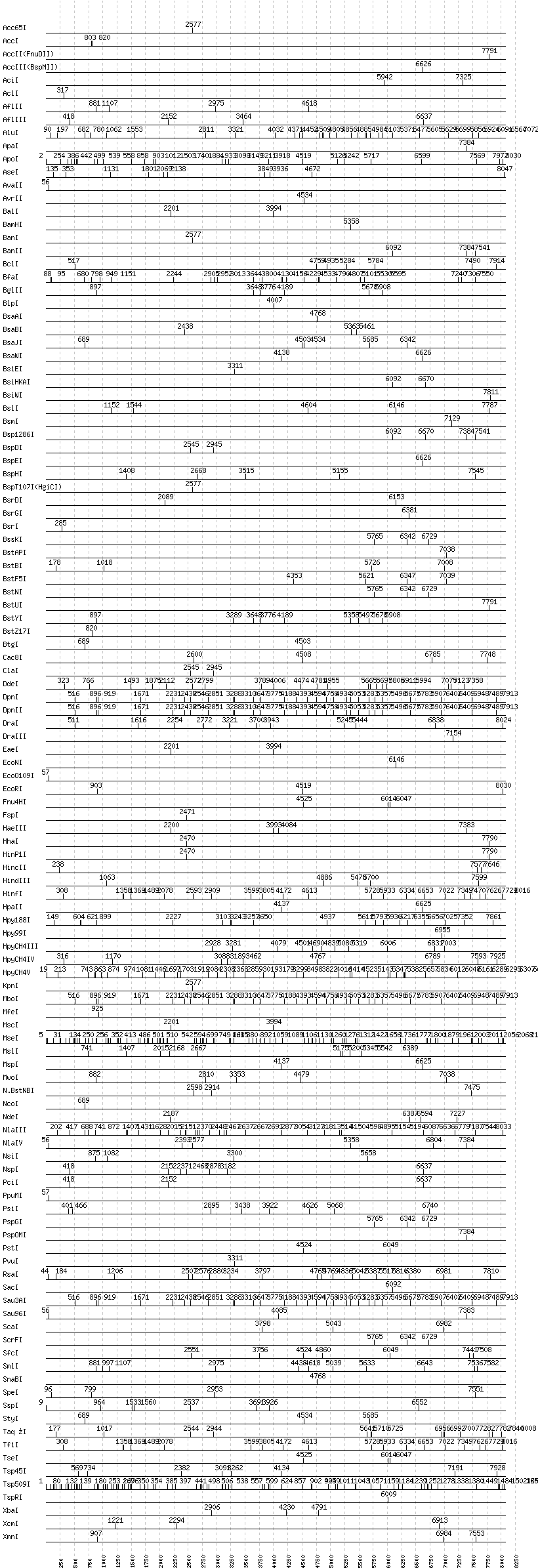 Uncut enzymes: AatII, AfeI, AgeI, AhdI, AlwI, AlwNI, Aor51HI(Eco47III), ApaLI, AscI, AvaI, BaeI, BbsI, BbvCI, BbvI, BcgI, BciVI, BglI, BmrI, BpmI, BsaHI, BsaI, BsaXI, BseRI, BsgI, BsmAI, BsmBI, BsmFI, BsoBI, BspMI, BsrBI, BsrFI, BssHII, BssSI, BstEII, BstXI, Bsu36I, BtrI, BtsI, Cfr10I, DrdI, EagI, EarI, EciI, EcoRV, FauI, FokI, FseI, HaeII, HgaI, HpaI, HphI, I-CeuI, I-SceI, KasI, MboII, MluI, MlyI, MnlI, MspA1I, NaeI, , NarI, NciI, NgoMIV, NheI, NotI, NruI, PI-PspI, PI-SceI(VDE), PacI, PaeR7I, PflFI, PflMI, PleI, PmeI, PmlI, PshAI, PvuII, RsrII, SacII, SalI, SapI, SbfI, SexAI, SfaNI, SfiI, SfoI, SgrAI, SmaI, SphI, StuI, SwaI, TliI, Tth111I, XhoI, XmaI