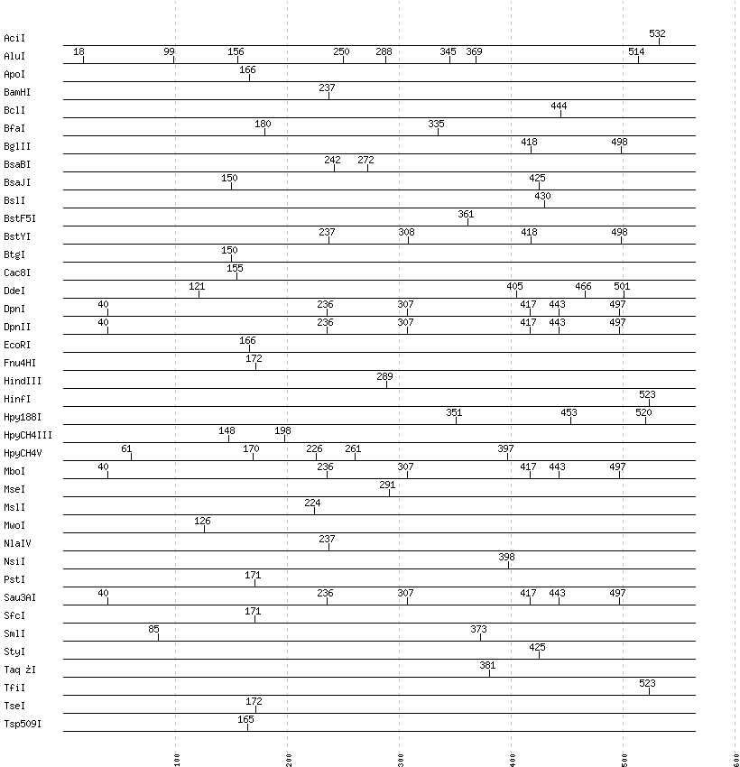 Uncut enzymes: AatII, Acc65I, AccI, AccII(FnuDII), AccIII(BspMII), AclI, AfeI, AflII, AflIII, AgeI, AhdI, AlwI, AlwNI, Aor51HI(Eco47III), ApaI, ApaLI, AscI, AseI, AvaI, AvaII, AvrII, BaeI, BalI, BanI, BanII, BbsI, BbvCI, BbvI, BcgI, BciVI, BglI, BlpI, BmrI, BpmI, BsaAI, BsaHI, BsaI, BsaWI, BsaXI, BseRI, BsgI, BsiEI, BsiHKAI, BsiWI, BsmAI, BsmBI, BsmFI, BsmI, BsoBI, Bsp1286I, BspDI, BspEI, BspHI, BspMI, BspT107I(HgiCI), BsrBI, BsrDI, BsrFI, BsrGI, BsrI, BssHII, BssKI, BssSI, BstAPI, BstBI, BstEII, BstNI, BstUI, BstXI, BstZ17I, Bsu36I, BtrI, BtsI, Cfr10I, ClaI, DraI, DraIII, DrdI, EaeI, EagI, EarI, EciI, EcoNI, EcoO109I, EcoRV, FauI, FokI, FseI, FspI, HaeII, HaeIII, HgaI, HhaI, HinP1I, HincII, HpaI, HpaII, HphI, Hpy99I, HpyCH4IV, I-CeuI, I-SceI, KasI, KpnI, MboII, MfeI, MluI, MlyI, MnlI, MscI, MspA1I, MspI, N.BstNBI, NaeI, , NarI, NciI, NcoI, NdeI, NgoMIV, NheI, NlaIII, NotI, NruI, NspI, PI-PspI, PI-SceI(VDE), PacI, PaeR7I, PciI, PflFI, PflMI, PleI, PmeI, PmlI, PpuMI, PshAI, PsiI, PspGI, PspOMI, PvuI, PvuII, RsaI, RsrII, SacI, SacII, SalI, SapI, Sau96I, SbfI, ScaI, ScrFI, SexAI, SfaNI, SfiI, SfoI, SgrAI, SmaI, SnaBI, SpeI, SphI, SspI, StuI, SwaI, TliI, Tsp45I, TspRI, Tth111I, XbaI, XcmI, XhoI, XmaI, XmnI