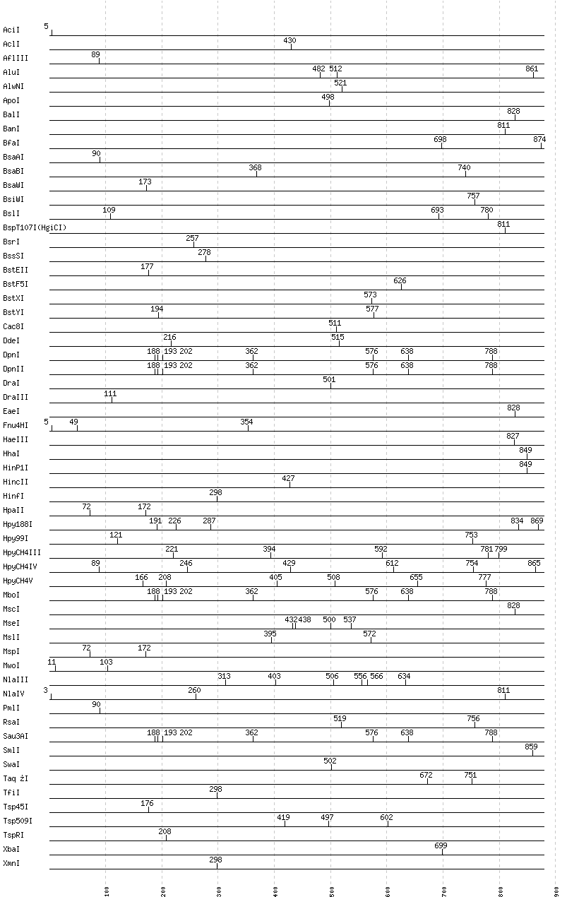 Uncut enzymes: AatII, Acc65I, AccI, AccII(FnuDII), AccIII(BspMII), AfeI, AflII, AgeI, AhdI, AlwI, Aor51HI(Eco47III), ApaI, ApaLI, AscI, AseI, AvaI, AvaII, AvrII, BaeI, BamHI, BanII, BbsI, BbvCI, BbvI, BcgI, BciVI, BclI, BglI, BglII, BlpI, BmrI, BpmI, BsaHI, BsaI, BsaJI, BsaXI, BseRI, BsgI, BsiEI, BsiHKAI, BsmAI, BsmBI, BsmFI, BsmI, BsoBI, Bsp1286I, BspDI, BspEI, BspHI, BspMI, BsrBI, BsrDI, BsrFI, BsrGI, BssHII, BssKI, BstAPI, BstBI, BstNI, BstUI, BstZ17I, Bsu36I, BtgI, BtrI, BtsI, Cfr10I, ClaI, DrdI, EagI, EarI, EciI, EcoNI, EcoO109I, EcoRI, EcoRV, FauI, FokI, FseI, FspI, HaeII, HgaI, HindIII, HpaI, HphI, I-CeuI, I-SceI, KasI, KpnI, MboII, MfeI, MluI, MlyI, MnlI, MspA1I, N.BstNBI, NaeI, , NarI, NciI, NcoI, NdeI, NgoMIV, NheI, NotI, NruI, NsiI, NspI, PI-PspI, PI-SceI(VDE), PacI, PaeR7I, PciI, PflFI, PflMI, PleI, PmeI, PpuMI, PshAI, PsiI, PspGI, PspOMI, PstI, PvuI, PvuII, RsrII, SacI, SacII, SalI, SapI, Sau96I, SbfI, ScaI, ScrFI, SexAI, SfaNI, SfcI, SfiI, SfoI, SgrAI, SmaI, SnaBI, SpeI, SphI, SspI, StuI, StyI, TliI, TseI, Tth111I, XcmI, XhoI, XmaI