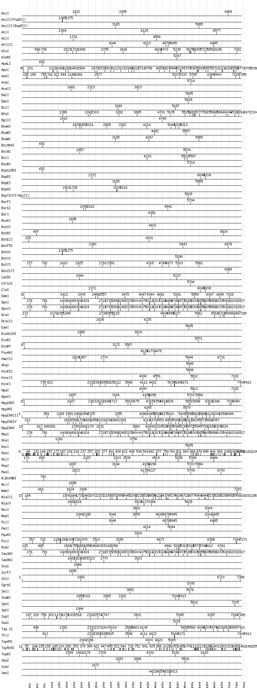 Uncut enzymes: AatII, Acc65I, AfeI, AflII, AgeI, AhdI, AlwI, Aor51HI(Eco47III), ApaI, AscI, AvrII, BaeI, BamHI, BanII, BbsI, BbvCI, BbvI, BcgI, BciVI, BglI, BlpI, BmrI, BpmI, BsaHI, BsaI, BsaJI, BsaXI, BseRI, BsgI, BsiEI, BsmAI, BsmBI, BsmFI, BsmI, BspMI, BsrBI, BsrDI, BssHII, BstAPI, BstNI, Bsu36I, BtgI, BtrI, BtsI, DrdI, EagI, EarI, EciI, EcoNI, FauI, FokI, FseI, FspI, HaeII, HgaI, HindIII, HphI, I-CeuI, I-SceI, KasI, KpnI, MboII, MluI, MlyI, MnlI, MspA1I, NaeI, , NarI, NcoI, NgoMIV, NheI, NotI, NruI, PI-PspI, PI-SceI(VDE), PacI, PaeR7I, PflFI, PflMI, PleI, PmeI, PshAI, PspGI, PspOMI, PstI, PvuI, PvuII, RsrII, SacI, SacII, SalI, SapI, SbfI, SexAI, SfaNI, SfiI, SfoI, SmaI, StuI, StyI, TliI, TseI, Tth111I, XhoI, XmaI