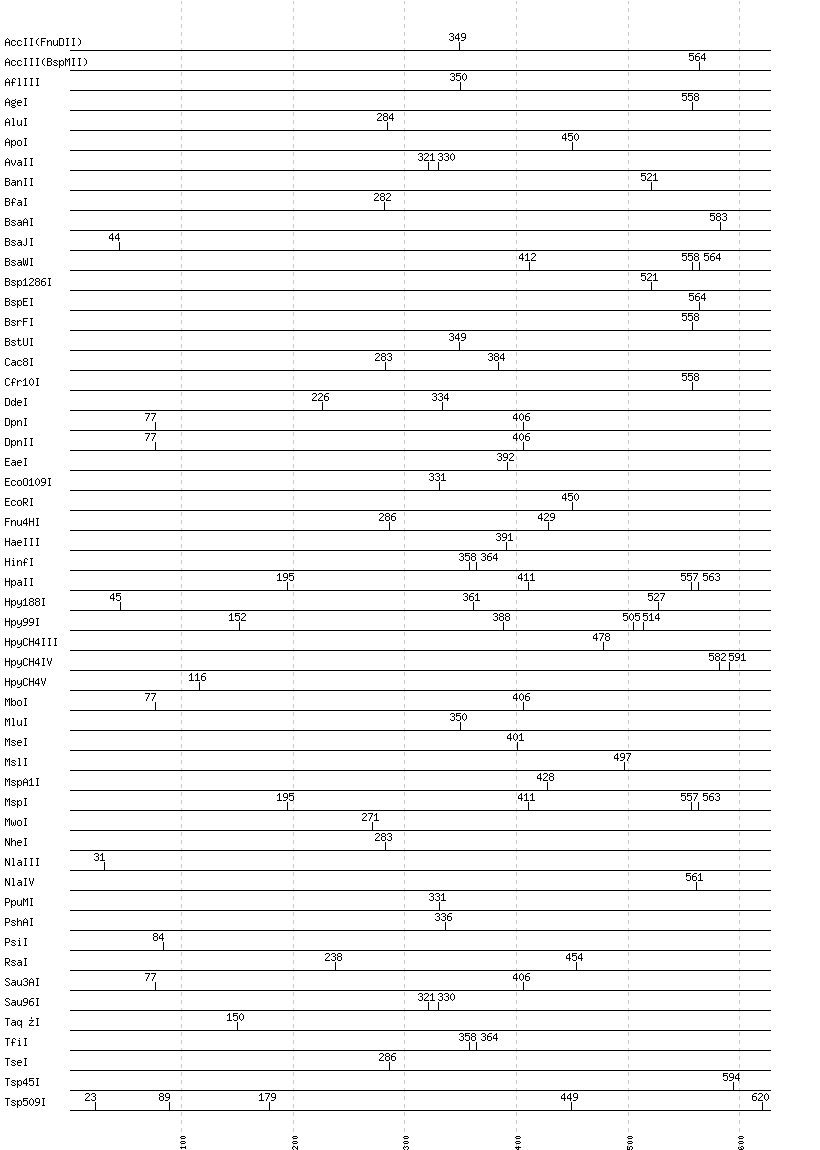 Uncut enzymes: AatII, Acc65I, AccI, AciI, AclI, AfeI, AflII, AhdI, AlwI, AlwNI, Aor51HI(Eco47III), ApaI, ApaLI, AscI, AseI, AvaI, AvrII, BaeI, BalI, BamHI, BanI, BbsI, BbvCI, BbvI, BcgI, BciVI, BclI, BglI, BglII, BlpI, BmrI, BpmI, BsaBI, BsaHI, BsaI, BsaXI, BseRI, BsgI, BsiEI, BsiHKAI, BsiWI, BslI, BsmAI, BsmBI, BsmFI, BsmI, BsoBI, BspDI, BspHI, BspMI, BspT107I(HgiCI), BsrBI, BsrDI, BsrGI, BsrI, BssHII, BssKI, BssSI, BstAPI, BstBI, BstEII, BstF5I, BstNI, BstXI, BstYI, BstZ17I, Bsu36I, BtgI, BtrI, BtsI, ClaI, DraI, DraIII, DrdI, EagI, EarI, EciI, EcoNI, EcoRV, FauI, FokI, FseI, FspI, HaeII, HgaI, HhaI, HinP1I, HincII, HindIII, HpaI, HphI, I-CeuI, I-SceI, KasI, KpnI, MboII, MfeI, MlyI, MnlI, MscI, N.BstNBI, NaeI, , NarI, NciI, NcoI, NdeI, NgoMIV, NotI, NruI, NsiI, NspI, PI-PspI, PI-SceI(VDE), PacI, PaeR7I, PciI, PflFI, PflMI, PleI, PmeI, PmlI, PspGI, PspOMI, PstI, PvuI, PvuII, RsrII, SacI, SacII, SalI, SapI, SbfI, ScaI, ScrFI, SexAI, SfaNI, SfcI, SfiI, SfoI, SgrAI, SmaI, SmlI, SnaBI, SpeI, SphI, SspI, StuI, StyI, SwaI, TliI, TspRI, Tth111I, XbaI, XcmI, XhoI, XmaI, XmnI