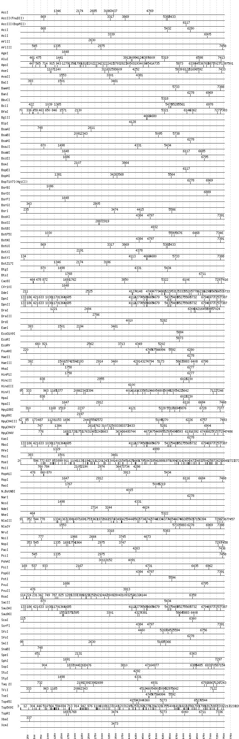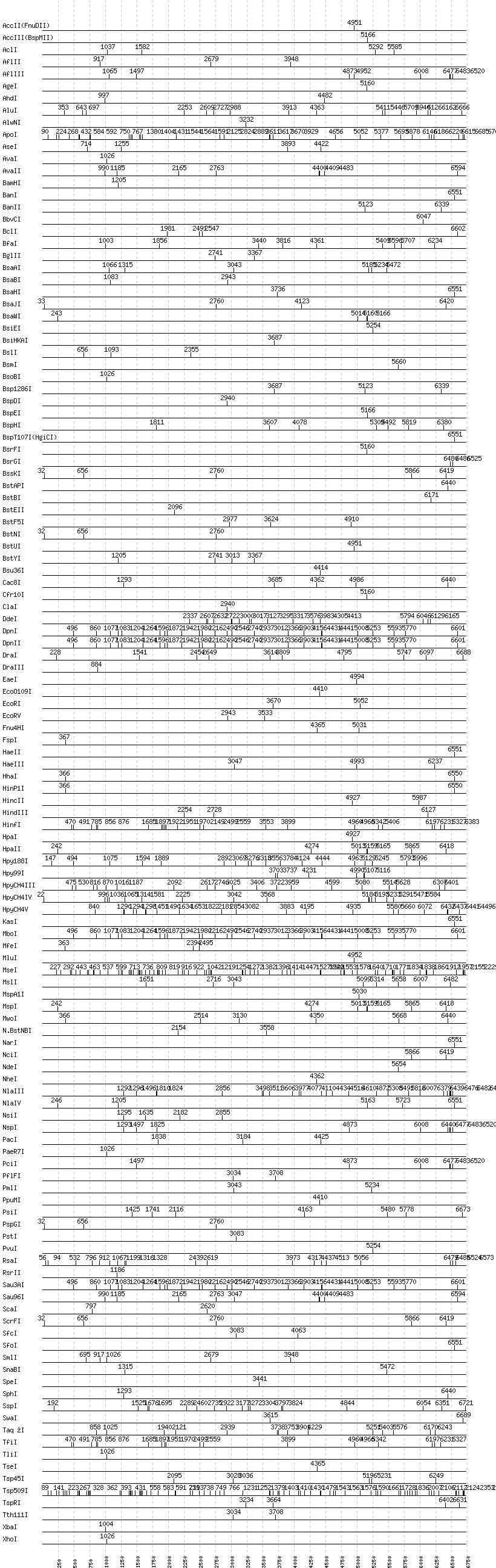 Uncut enzymes: AatII, Acc65I, AccI, AciI, AfeI, AlwI, Aor51HI(Eco47III), ApaI, ApaLI, AscI, AvrII, BaeI, BalI, BbsI, BbvI, BcgI, BciVI, BglI, BlpI, BmrI, BpmI, BsaI, BsaXI, BseRI, BsgI, BsiWI, BsmAI, BsmBI, BsmFI, BspMI, BsrBI, BsrDI, BsrI, BssHII, BssSI, BstXI, BstZ17I, BtgI, BtrI, BtsI, DrdI, EagI, EarI, EciI, EcoNI, FauI, FokI, FseI, HgaI, HphI, I-CeuI, I-SceI, KpnI, MboII, MlyI, MnlI, MscI, NaeI, , NcoI, NgoMIV, NotI, NruI, PI-PspI, PI-SceI(VDE), PflMI, PleI, PmeI, PshAI, PspOMI, PvuII, SacI, SacII, SalI, SapI, SbfI, SexAI, SfaNI, SfiI, SgrAI, SmaI, StuI, StyI, XcmI, XmaI, XmnI