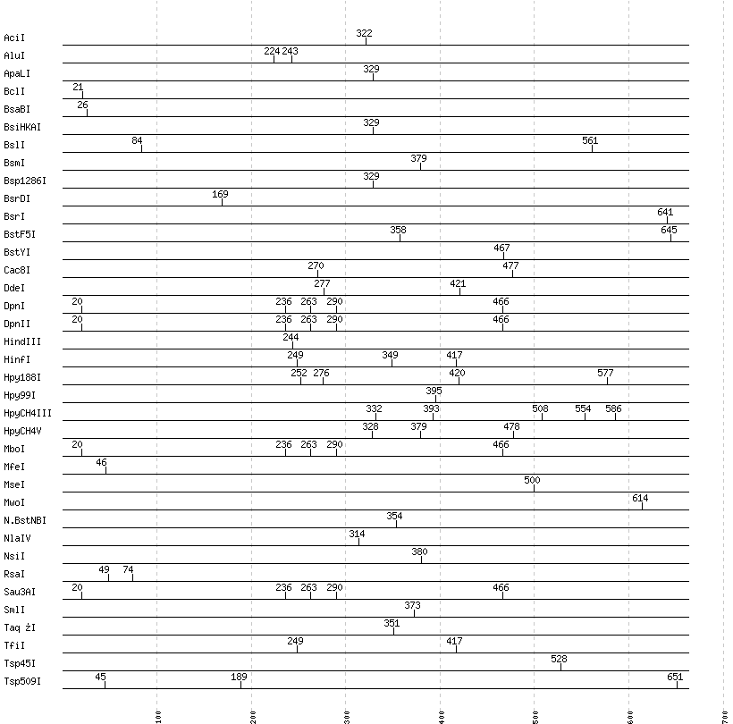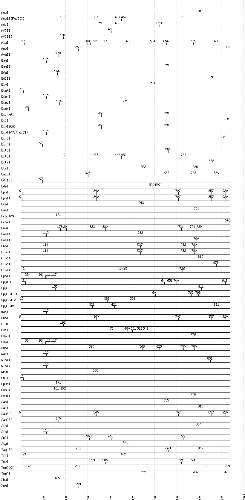 Uncut enzymes: AatII, Acc65I, AccI, AccII(FnuDII), AccIII(BspMII), AclI, AfeI, AflII, AflIII, AgeI, AhdI, AlwI, AlwNI, Aor51HI(Eco47III), ApaI, ApoI, AscI, AseI, AvaI, AvaII, AvrII, BaeI, BalI, BamHI, BanI, BanII, BbsI, BbvCI, BbvI, BcgI, BciVI, BfaI, BglI, BglII, BlpI, BmrI, BpmI, BsaAI, BsaHI, BsaI, BsaJI, BsaWI, BsaXI, BseRI, BsgI, BsiEI, BsiWI, BsmAI, BsmBI, BsmFI, BsoBI, BspDI, BspEI, BspHI, BspMI, BspT107I(HgiCI), BsrBI, BsrFI, BsrGI, BssHII, BssKI, BssSI, BstAPI, BstBI, BstEII, BstNI, BstUI, BstXI, BstZ17I, Bsu36I, BtgI, BtrI, BtsI, Cfr10I, ClaI, DraI, DraIII, DrdI, EaeI, EagI, EarI, EciI, EcoNI, EcoO109I, EcoRI, EcoRV, FauI, Fnu4HI, FokI, FseI, FspI, HaeII, HaeIII, HgaI, HhaI, HinP1I, HincII, HpaI, HpaII, HphI, HpyCH4IV, I-CeuI, I-SceI, KasI, KpnI, MboII, MluI, MlyI, MnlI, MscI, MslI, MspA1I, MspI, NaeI, , NarI, NciI, NcoI, NdeI, NgoMIV, NheI, NlaIII, NotI, NruI, NspI, PI-PspI, PI-SceI(VDE), PacI, PaeR7I, PciI, PflFI, PflMI, PleI, PmeI, PmlI, PpuMI, PshAI, PsiI, PspGI, PspOMI, PstI, PvuI, PvuII, RsrII, SacI, SacII, SalI, SapI, Sau96I, SbfI, ScaI, ScrFI, SexAI, SfaNI, SfcI, SfiI, SfoI, SgrAI, SmaI, SnaBI, SpeI, SphI, SspI, StuI, StyI, SwaI, TliI, TseI, TspRI, Tth111I, XbaI, XcmI, XhoI, XmaI, XmnI