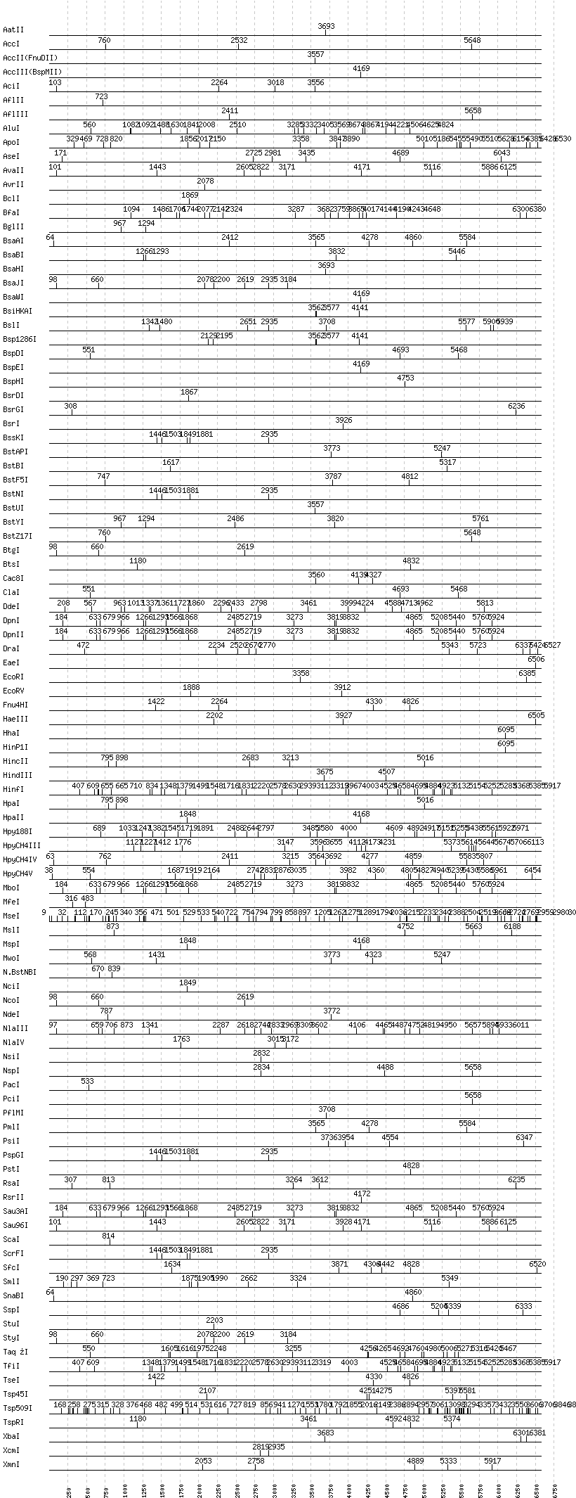 Uncut enzymes: Acc65I, AclI, AfeI, AgeI, AhdI, AlwI, AlwNI, Aor51HI(Eco47III), ApaI, ApaLI, AscI, AvaI, BaeI, BalI, BamHI, BanI, BanII, BbsI, BbvCI, BbvI, BcgI, BciVI, BglI, BlpI, BmrI, BpmI, BsaI, BsaXI, BseRI, BsgI, BsiEI, BsiWI, BsmAI, BsmBI, BsmFI, BsmI, BsoBI, BspMI, BspT107I(HgiCI), BsrBI, BsrFI, BssHII, BssSI, BstEII, BstXI, Bsu36I, BtrI, Cfr10I, DraIII, DrdI, EagI, EarI, EciI, EcoNI, EcoO109I, FauI, FokI, FseI, FspI, HaeII, HgaI, HphI, Hpy99I, I-CeuI, I-SceI, KasI, KpnI, MboII, MluI, MlyI, MnlI, MscI, MspA1I, NaeI, , NarI, NgoMIV, NheI, NotI, NruI, PI-PspI, PI-SceI(VDE), PaeR7I, PflFI, PleI, PmeI, PpuMI, PshAI, PspOMI, PvuI, PvuII, SacI, SacII, SalI, SapI, SbfI, SexAI, SfaNI, SfiI, SfoI, SgrAI, SmaI, SpeI, SphI, SwaI, TliI, Tth111I, XhoI, XmaI