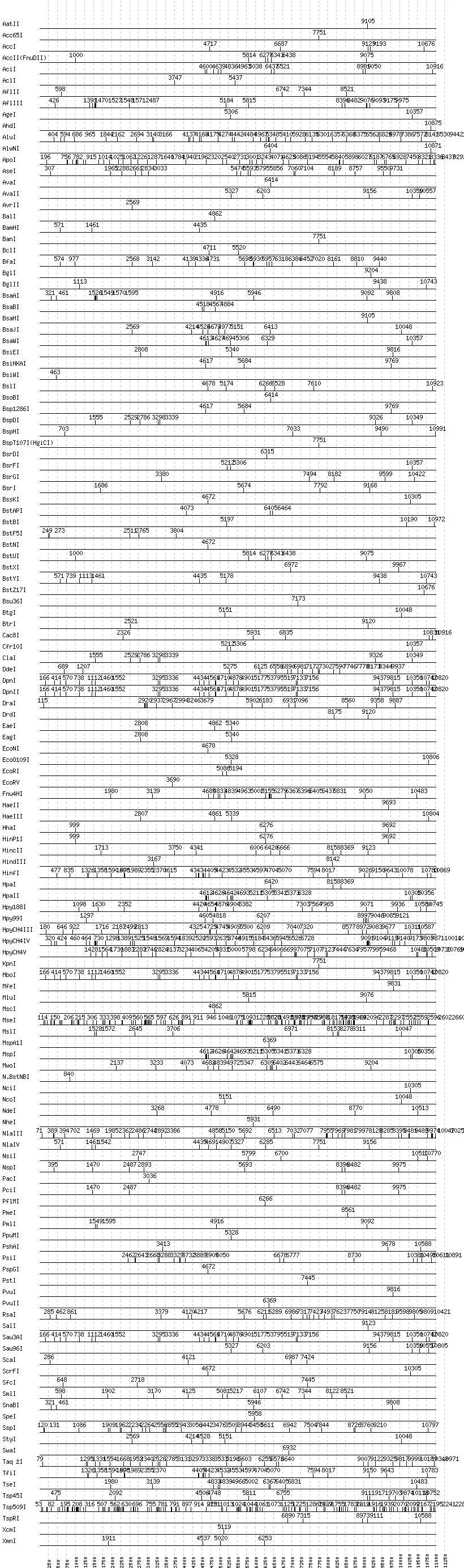 Uncut enzymes: AccIII(BspMII), AfeI, AlwI, Aor51HI(Eco47III), ApaI, ApaLI, AscI, BaeI, BanII, BbsI, BbvCI, BbvI, BcgI, BciVI, BlpI, BmrI, BpmI, BsaI, BsaXI, BseRI, BsgI, BsmAI, BsmBI, BsmFI, BsmI, BspEI, BspMI, BsrBI, BssHII, BssSI, BstEII, BtsI, DraIII, EarI, EciI, FauI, FokI, FseI, FspI, HgaI, HphI, I-CeuI, I-SceI, KasI, MboII, MlyI, MnlI, NaeI, , NarI, NgoMIV, NotI, NruI, PI-PspI, PI-SceI(VDE), PaeR7I, PflFI, PleI, PspOMI, RsrII, SacI, SacII, SapI, SbfI, SexAI, SfaNI, SfiI, SfoI, SgrAI, SmaI, SphI, StuI, TliI, Tth111I, XbaI, XhoI, XmaI