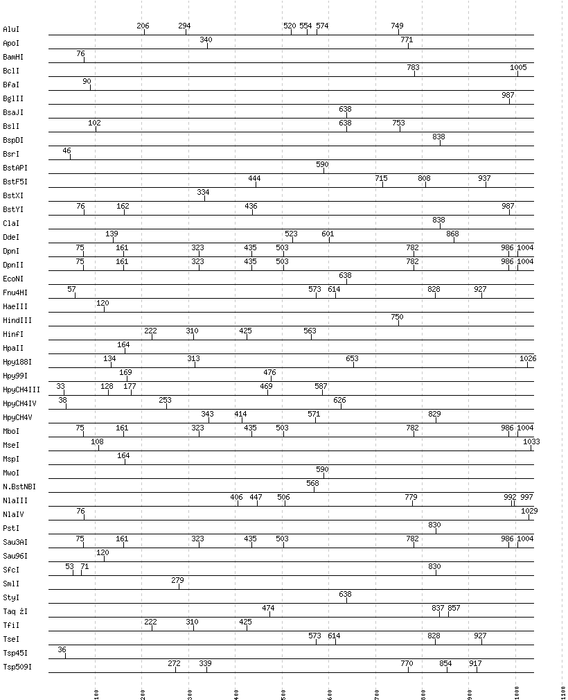 Uncut enzymes: AatII, Acc65I, AccI, AccII(FnuDII), AccIII(BspMII), AciI, AclI, AfeI, AflII, AflIII, AgeI, AhdI, AlwI, AlwNI, Aor51HI(Eco47III), ApaI, ApaLI, AscI, AseI, AvaI, AvaII, AvrII, BaeI, BalI, BanI, BanII, BbsI, BbvCI, BbvI, BcgI, BciVI, BglI, BlpI, BmrI, BpmI, BsaAI, BsaBI, BsaHI, BsaI, BsaWI, BsaXI, BseRI, BsgI, BsiEI, BsiHKAI, BsiWI, BsmAI, BsmBI, BsmFI, BsmI, BsoBI, Bsp1286I, BspEI, BspHI, BspMI, BspT107I(HgiCI), BsrBI, BsrDI, BsrFI, BsrGI, BssHII, BssKI, BssSI, BstBI, BstEII, BstNI, BstUI, BstZ17I, Bsu36I, BtgI, BtrI, BtsI, Cac8I, Cfr10I, DraI, DraIII, DrdI, EaeI, EagI, EarI, EciI, EcoO109I, EcoRI, EcoRV, FauI, FokI, FseI, FspI, HaeII, HgaI, HhaI, HinP1I, HincII, HpaI, HphI, I-CeuI, I-SceI, KasI, KpnI, MboII, MfeI, MluI, MlyI, MnlI, MscI, MslI, MspA1I, NaeI, , NarI, NciI, NcoI, NdeI, NgoMIV, NheI, NotI, NruI, NsiI, NspI, PI-PspI, PI-SceI(VDE), PacI, PaeR7I, PciI, PflFI, PflMI, PleI, PmeI, PmlI, PpuMI, PshAI, PsiI, PspGI, PspOMI, PvuI, PvuII, RsaI, RsrII, SacI, SacII, SalI, SapI, SbfI, ScaI, ScrFI, SexAI, SfaNI, SfiI, SfoI, SgrAI, SmaI, SnaBI, SpeI, SphI, SspI, StuI, SwaI, TliI, TspRI, Tth111I, XbaI, XcmI, XhoI, XmaI, XmnI