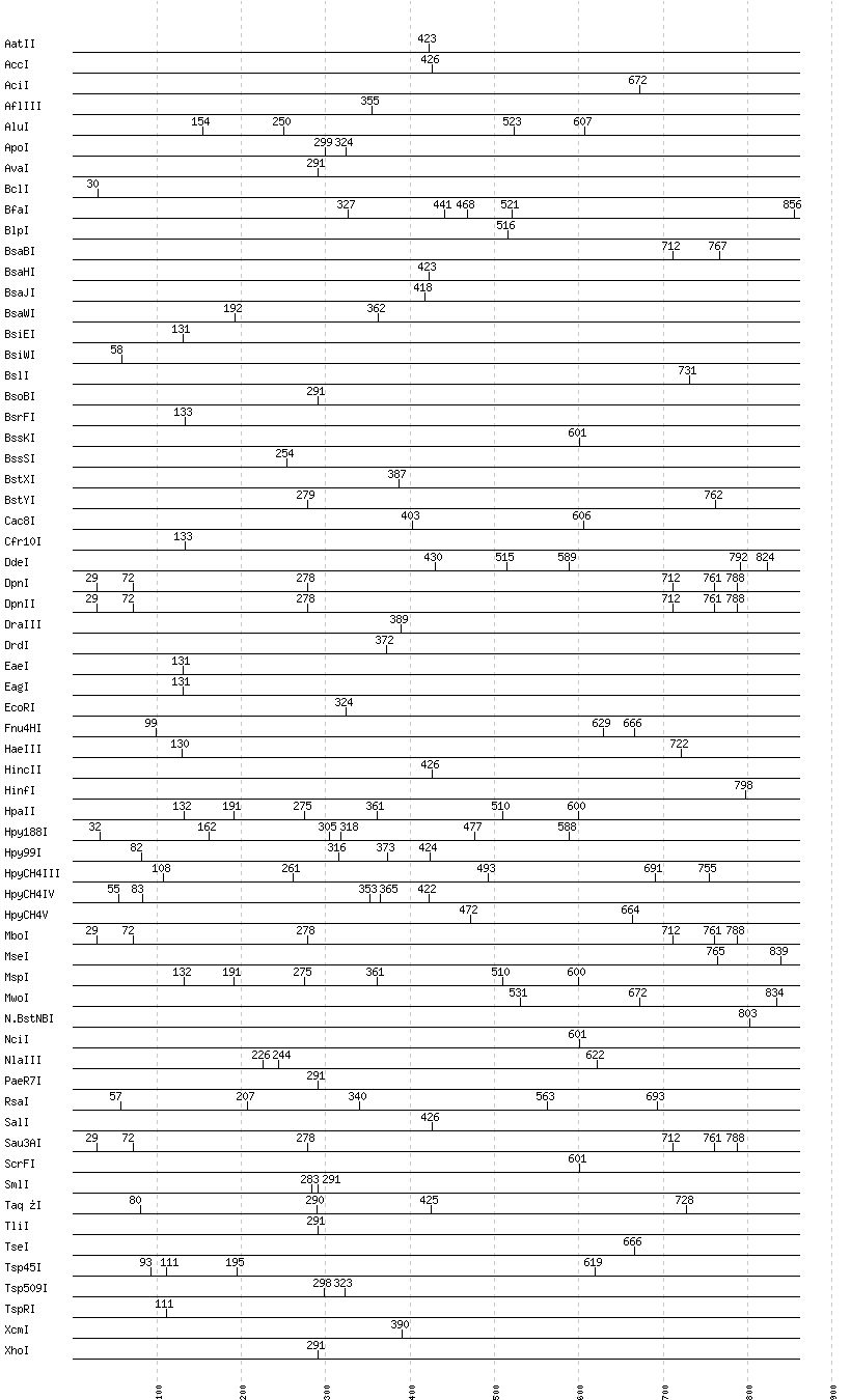 Uncut enzymes: Acc65I, AccII(FnuDII), AccIII(BspMII), AclI, AfeI, AflII, AgeI, AhdI, AlwI, AlwNI, Aor51HI(Eco47III), ApaI, ApaLI, AscI, AseI, AvaII, AvrII, BaeI, BalI, BamHI, BanI, BanII, BbsI, BbvCI, BbvI, BcgI, BciVI, BglI, BglII, BmrI, BpmI, BsaAI, BsaI, BsaXI, BseRI, BsgI, BsiHKAI, BsmAI, BsmBI, BsmFI, BsmI, Bsp1286I, BspDI, BspEI, BspHI, BspMI, BspT107I(HgiCI), BsrBI, BsrDI, BsrGI, BsrI, BssHII, BstAPI, BstBI, BstEII, BstF5I, BstNI, BstUI, BstZ17I, Bsu36I, BtgI, BtrI, BtsI, ClaI, DraI, EarI, EciI, EcoNI, EcoO109I, EcoRV, FauI, FokI, FseI, FspI, HaeII, HgaI, HhaI, HinP1I, HindIII, HpaI, HphI, I-CeuI, I-SceI, KasI, KpnI, MboII, MfeI, MluI, MlyI, MnlI, MscI, MslI, MspA1I, NaeI, , NarI, NcoI, NdeI, NgoMIV, NheI, NlaIV, NotI, NruI, NsiI, NspI, PI-PspI, PI-SceI(VDE), PacI, PciI, PflFI, PflMI, PleI, PmeI, PmlI, PpuMI, PshAI, PsiI, PspGI, PspOMI, PstI, PvuI, PvuII, RsrII, SacI, SacII, SapI, Sau96I, SbfI, ScaI, SexAI, SfaNI, SfcI, SfiI, SfoI, SgrAI, SmaI, SnaBI, SpeI, SphI, SspI, StuI, StyI, SwaI, TfiI, Tth111I, XbaI, XmaI, XmnI
