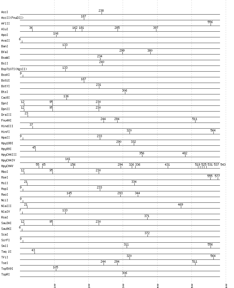 Uncut enzymes: AatII, Acc65I, AccIII(BspMII), AciI, AclI, AfeI, AflIII, AgeI, AhdI, AlwI, AlwNI, Aor51HI(Eco47III), ApaI, ApaLI, AscI, AseI, AvaI, AvrII, BaeI, BalI, BamHI, BanII, BbsI, BbvCI, BbvI, BcgI, BciVI, BclI, BglI, BglII, BlpI, BmrI, BpmI, BsaAI, BsaBI, BsaHI, BsaI, BsaJI, BsaXI, BseRI, BsgI, BsiEI, BsiHKAI, BsiWI, BsmAI, BsmBI, BsmFI, BsmI, BsoBI, Bsp1286I, BspDI, BspEI, BspHI, BspMI, BsrBI, BsrDI, BsrFI, BsrGI, BsrI, BssHII, BssSI, BstAPI, BstBI, BstEII, BstF5I, BstNI, BstXI, BstZ17I, Bsu36I, BtgI, BtrI, Cfr10I, ClaI, DdeI, DraI, DrdI, EaeI, EagI, EarI, EciI, EcoNI, EcoO109I, EcoRI, EcoRV, FauI, FokI, FseI, FspI, HaeII, HaeIII, HgaI, HhaI, HinP1I, HincII, HpaI, HphI, I-CeuI, I-SceI, KasI, KpnI, MboII, MfeI, MluI, MlyI, MnlI, MscI, MspA1I, N.BstNBI, NaeI, , NarI, NcoI, NdeI, NgoMIV, NheI, NotI, NruI, NsiI, NspI, PI-PspI, PI-SceI(VDE), PacI, PaeR7I, PciI, PflFI, PflMI, PleI, PmeI, PmlI, PpuMI, PshAI, PsiI, PspGI, PspOMI, PstI, PvuI, PvuII, RsrII, SacI, SacII, SalI, SapI, SbfI, SexAI, SfaNI, SfcI, SfiI, SfoI, SgrAI, SmaI, SnaBI, SpeI, SphI, SspI, StuI, StyI, SwaI, TliI, Tsp45I, Tth111I, XbaI, XcmI, XhoI, XmaI, XmnI