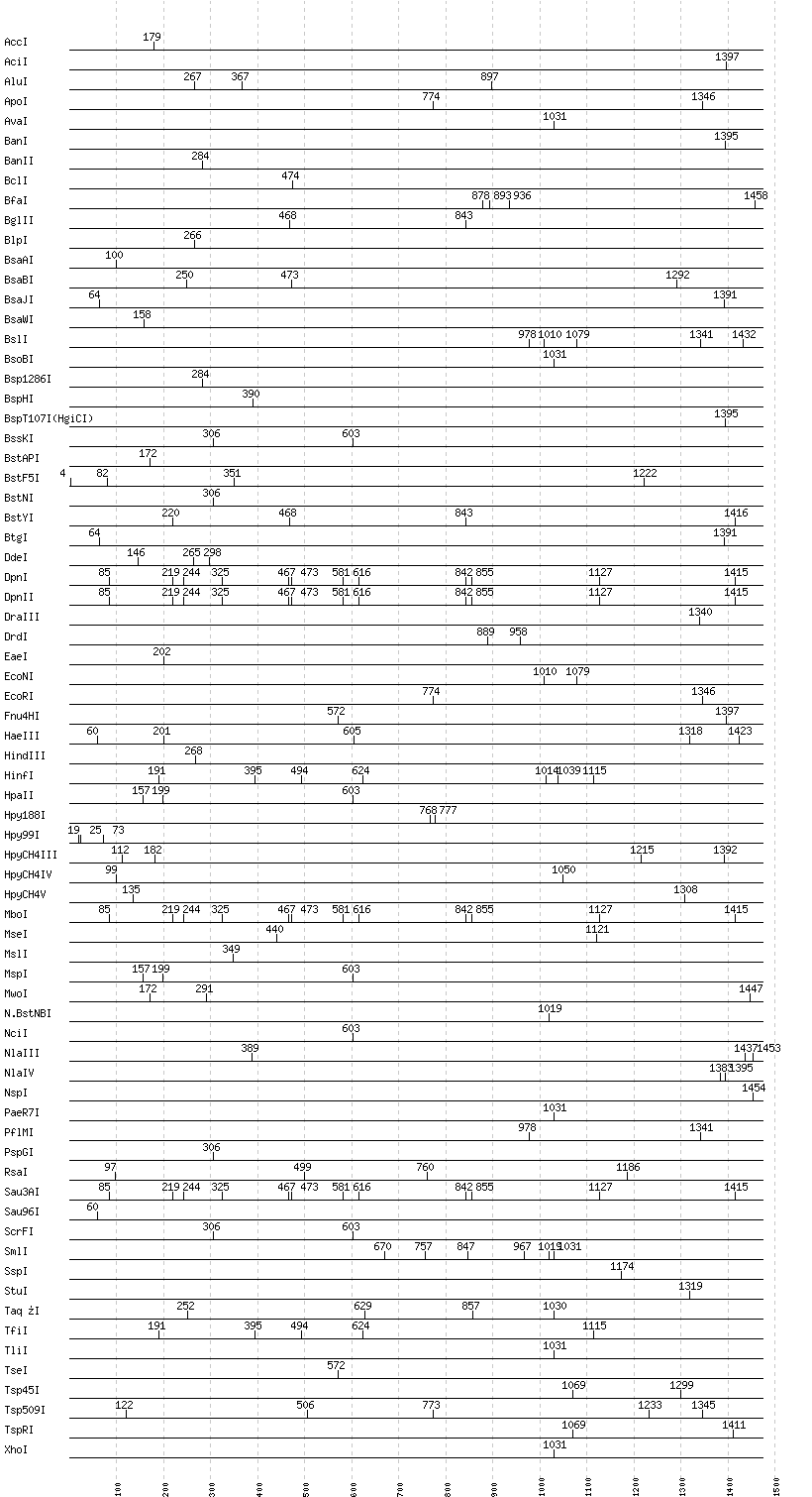 Uncut enzymes: AatII, Acc65I, AccII(FnuDII), AccIII(BspMII), AclI, AfeI, AflII, AflIII, AgeI, AhdI, AlwI, AlwNI, Aor51HI(Eco47III), ApaI, ApaLI, AscI, AseI, AvaII, AvrII, BaeI, BalI, BamHI, BbsI, BbvCI, BbvI, BcgI, BciVI, BglI, BmrI, BpmI, BsaHI, BsaI, BsaXI, BseRI, BsgI, BsiEI, BsiHKAI, BsiWI, BsmAI, BsmBI, BsmFI, BsmI, BspDI, BspEI, BspMI, BsrBI, BsrDI, BsrFI, BsrGI, BsrI, BssHII, BssSI, BstBI, BstEII, BstUI, BstXI, BstZ17I, Bsu36I, BtrI, BtsI, Cac8I, Cfr10I, ClaI, DraI, EagI, EarI, EciI, EcoO109I, EcoRV, FauI, FokI, FseI, FspI, HaeII, HgaI, HhaI, HinP1I, HincII, HpaI, HphI, I-CeuI, I-SceI, KasI, KpnI, MboII, MfeI, MluI, MlyI, MnlI, MscI, MspA1I, NaeI, , NarI, NcoI, NdeI, NgoMIV, NheI, NotI, NruI, NsiI, PI-PspI, PI-SceI(VDE), PacI, PciI, PflFI, PleI, PmeI, PmlI, PpuMI, PshAI, PsiI, PspOMI, PstI, PvuI, PvuII, RsrII, SacI, SacII, SalI, SapI, SbfI, ScaI, SexAI, SfaNI, SfcI, SfiI, SfoI, SgrAI, SmaI, SnaBI, SpeI, SphI, StyI, SwaI, Tth111I, XbaI, XcmI, XmaI, XmnI