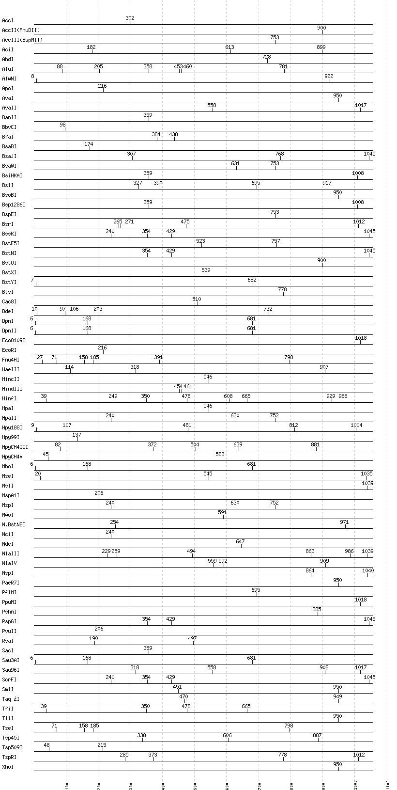 Uncut enzymes: AatII, Acc65I, AclI, AfeI, AflII, AflIII, AgeI, AlwI, Aor51HI(Eco47III), ApaI, ApaLI, AscI, AseI, AvrII, BaeI, BalI, BamHI, BanI, BbsI, BbvI, BcgI, BciVI, BclI, BglI, BglII, BlpI, BmrI, BpmI, BsaAI, BsaHI, BsaI, BsaXI, BseRI, BsgI, BsiEI, BsiWI, BsmAI, BsmBI, BsmFI, BsmI, BspDI, BspHI, BspMI, BspT107I(HgiCI), BsrBI, BsrDI, BsrFI, BsrGI, BssHII, BssSI, BstAPI, BstBI, BstEII, BstZ17I, Bsu36I, BtgI, BtrI, Cfr10I, ClaI, DraI, DraIII, DrdI, EaeI, EagI, EarI, EciI, EcoNI, EcoRV, FauI, FokI, FseI, FspI, HaeII, HgaI, HhaI, HinP1I, HphI, HpyCH4IV, I-CeuI, I-SceI, KasI, KpnI, MboII, MfeI, MluI, MlyI, MnlI, MscI, NaeI, , NarI, NcoI, NgoMIV, NheI, NotI, NruI, NsiI, PI-PspI, PI-SceI(VDE), PacI, PciI, PflFI, PleI, PmeI, PmlI, PsiI, PspOMI, PstI, PvuI, RsrII, SacII, SalI, SapI, SbfI, ScaI, SexAI, SfaNI, SfcI, SfiI, SfoI, SgrAI, SmaI, SnaBI, SpeI, SphI, SspI, StuI, StyI, SwaI, Tth111I, XbaI, XcmI, XmaI, XmnI