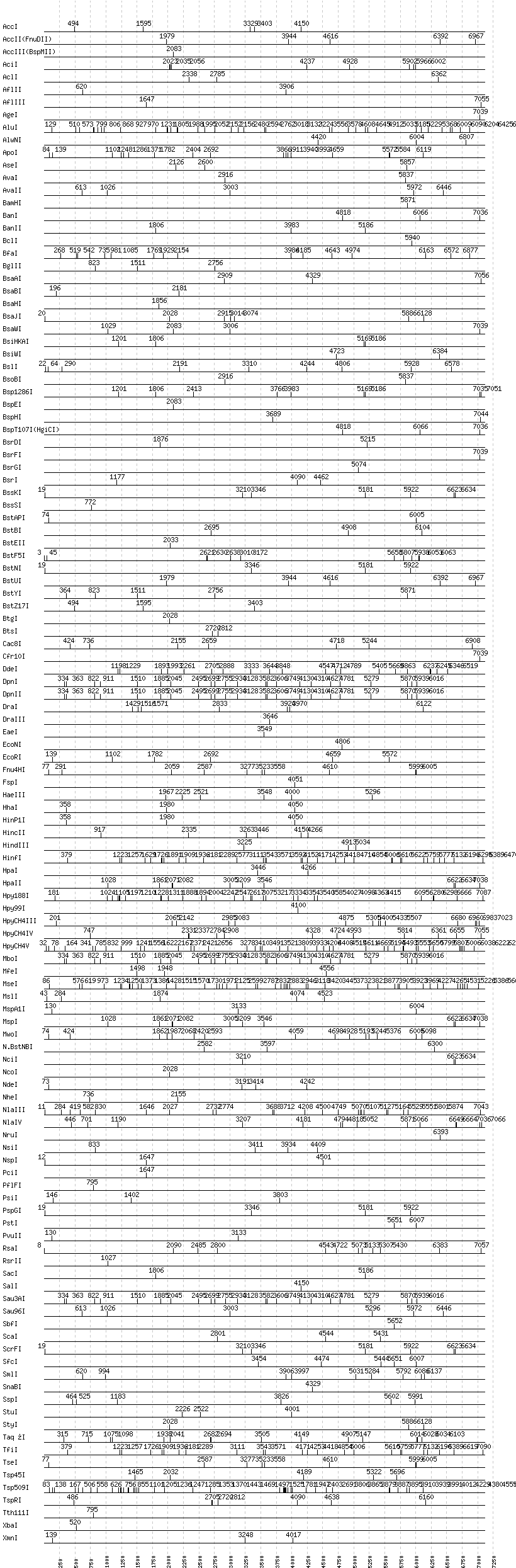 Uncut enzymes: AatII, Acc65I, AfeI, AhdI, AlwI, Aor51HI(Eco47III), ApaI, ApaLI, AscI, AvrII, BaeI, BalI, BbsI, BbvCI, BbvI, BcgI, BciVI, BglI, BlpI, BmrI, BpmI, BsaI, BsaXI, BseRI, BsgI, BsiEI, BsmAI, BsmBI, BsmFI, BsmI, BspDI, BspMI, BsrBI, BssHII, BstXI, Bsu36I, BtrI, ClaI, DrdI, EagI, EarI, EciI, EcoO109I, EcoRV, FauI, FokI, FseI, HaeII, HgaI, HphI, I-CeuI, I-SceI, KasI, KpnI, MboII, MluI, MlyI, MnlI, MscI, NaeI, , NarI, NgoMIV, NotI, PI-PspI, PI-SceI(VDE), PacI, PaeR7I, PflMI, PleI, PmeI, PmlI, PpuMI, PshAI, PspOMI, PvuI, SacII, SapI, SexAI, SfaNI, SfiI, SfoI, SgrAI, SmaI, SpeI, SphI, SwaI, TliI, XcmI, XhoI, XmaI