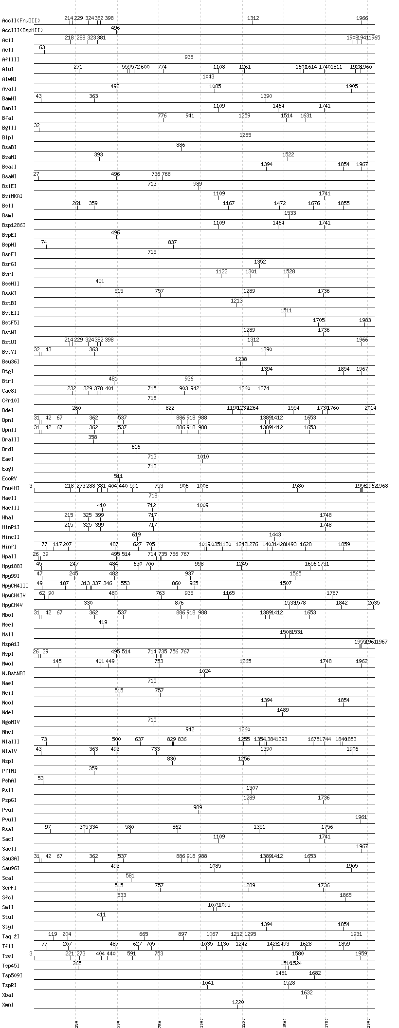 Uncut enzymes: AatII, Acc65I, AccI, AfeI, AflII, AgeI, AhdI, AlwI, Aor51HI(Eco47III), ApaI, ApaLI, ApoI, AscI, AseI, AvaI, AvrII, BaeI, BalI, BanI, BbsI, BbvCI, BbvI, BcgI, BciVI, BclI, BglI, BmrI, BpmI, BsaAI, BsaI, BsaXI, BseRI, BsgI, BsiWI, BsmAI, BsmBI, BsmFI, BsoBI, BspDI, BspMI, BspT107I(HgiCI), BsrBI, BsrDI, BssSI, BstAPI, BstXI, BstZ17I, BtsI, ClaI, DraI, EarI, EciI, EcoNI, EcoO109I, EcoRI, FauI, FokI, FseI, FspI, HgaI, HindIII, HpaI, HphI, I-CeuI, I-SceI, KasI, KpnI, MboII, MfeI, MluI, MlyI, MnlI, MscI, , NarI, NotI, NruI, NsiI, PI-PspI, PI-SceI(VDE), PacI, PaeR7I, PciI, PflFI, PleI, PmeI, PmlI, PpuMI, PspOMI, PstI, RsrII, SalI, SapI, SbfI, SexAI, SfaNI, SfiI, SfoI, SgrAI, SmaI, SnaBI, SpeI, SphI, SspI, SwaI, TliI, Tth111I, XcmI, XhoI, XmaI
