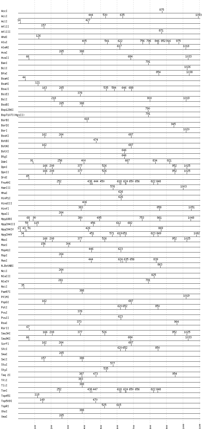 Uncut enzymes: AatII, Acc65I, AccII(FnuDII), AccIII(BspMII), AfeI, AgeI, AlwI, Aor51HI(Eco47III), ApaI, ApaLI, ApoI, AscI, AseI, AvrII, BaeI, BalI, BamHI, BanII, BbsI, BbvCI, BbvI, BcgI, BciVI, BglI, BglII, BlpI, BmrI, BpmI, BsaBI, BsaI, BsaWI, BsaXI, BseRI, BsgI, BsiHKAI, BsiWI, BsmAI, BsmBI, BsmFI, BsmI, BspDI, BspEI, BspHI, BspMI, BsrFI, BsrGI, BssHII, BssSI, BstAPI, BstEII, BstF5I, BstUI, BstYI, BstZ17I, Bsu36I, BtrI, BtsI, Cac8I, Cfr10I, ClaI, DraI, DraIII, EaeI, EagI, EarI, EciI, EcoNI, EcoO109I, EcoRI, EcoRV, FauI, FokI, FseI, FspI, HaeII, HgaI, HincII, HpaI, HphI, Hpy99I, I-CeuI, I-SceI, KasI, KpnI, MboII, MfeI, MluI, MlyI, MnlI, MscI, MslI, NaeI, , NarI, NcoI, NdeI, NgoMIV, NheI, NotI, NruI, NspI, PI-PspI, PI-SceI(VDE), PacI, PciI, PflFI, PleI, PmeI, PmlI, PpuMI, PshAI, PsiI, PspOMI, SacI, SacII, SalI, SapI, SbfI, ScaI, SexAI, SfaNI, SfiI, SfoI, SgrAI, SnaBI, SpeI, SphI, SspI, SwaI, Tth111I, XbaI, XcmI, XmnI
