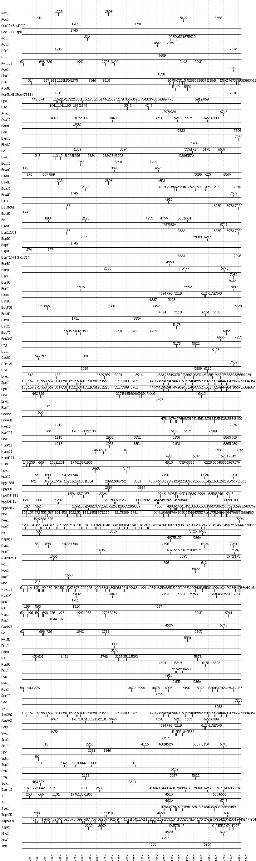 Uncut enzymes: Acc65I, AlwI, ApaI, ApaLI, AscI, AvrII, BaeI, BalI, BbsI, BbvI, BcgI, BciVI, BglI, BlpI, BmrI, BpmI, BsaI, BsaXI, BseRI, BsgI, BsmAI, BsmBI, BsmFI, BsmI, BspMI, BssHII, BssSI, BstAPI, BstEII, BstZ17I, BtrI, DraIII, EagI, EarI, EciI, EcoNI, EcoO109I, EcoRI, FauI, FokI, FseI, FspI, HgaI, HphI, I-CeuI, I-SceI, KasI, KpnI, MboII, MluI, MlyI, MnlI, MscI, NaeI, , NarI, NgoMIV, NotI, PI-PspI, PI-SceI(VDE), PflFI, PleI, PmeI, PpuMI, PspOMI, SacII, SapI, SbfI, ScaI, SexAI, SfaNI, SfiI, SfoI, SgrAI, SnaBI, Tth111I, XbaI, XcmI